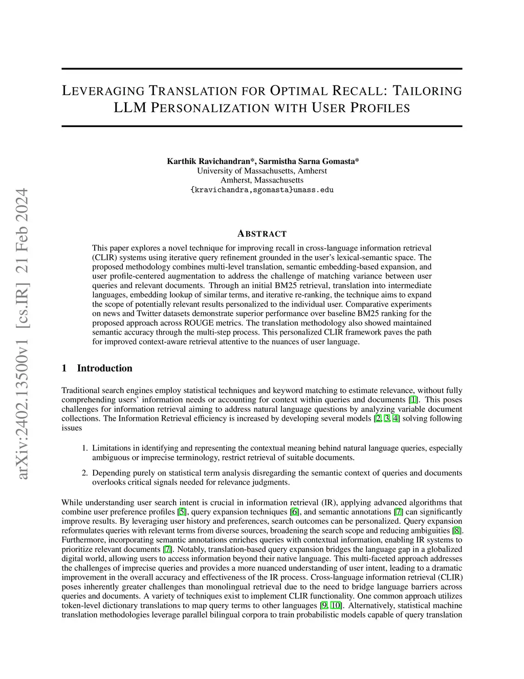 This paper explores a novel technique for improving recall in cross-language information retrieval (CLIR) systems using iterative query refinement grounded in the user's lexical-semantic space. The proposed methodology combines multi-level translation, semantic embedding-based expansion, and user profile-centered augmentation to address the challenge of matching variance between user queries and relevant documents. Through an initial BM25 retrieval, translation into intermediate languages, embedding lookup of similar terms, and iterative re-ranking, the technique aims to expand the scope of potentially relevant results personalized to the individual user. Comparative experiments on news and Twitter datasets demonstrate superior performance over baseline BM25 ranking for the proposed approach across ROUGE metrics. The translation methodology also showed maintained semantic accuracy through the multi-step process. This personalized CLIR framework paves the path for improved context-aware retrieval attentive to the nuances of user language.