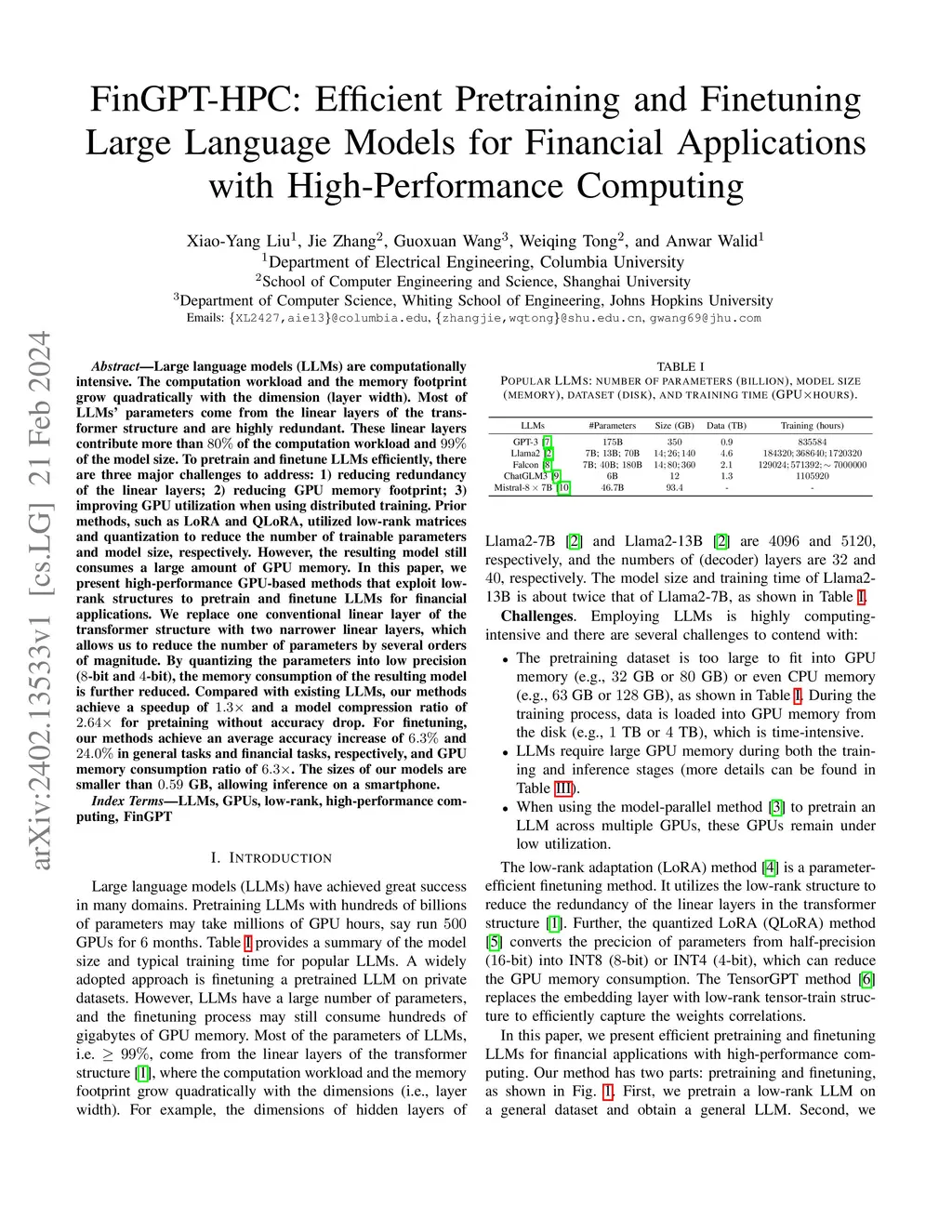Large language models (LLMs) are computationally intensive. The computation workload and the memory footprint grow quadratically with the dimension (layer width). Most of LLMs' parameters come from the linear layers of the transformer structure and are highly redundant. These linear layers contribute more than 80% of the computation workload and 99% of the model size. To pretrain and finetune LLMs efficiently, there are three major challenges to address: 1) reducing redundancy of the linear layers; 2) reducing GPU memory footprint; 3) improving GPU utilization when using distributed training. Prior methods, such as LoRA and QLoRA, utilized low-rank matrices and quantization to reduce the number of trainable parameters and model size, respectively. However, the resulting model still consumes a large amount of GPU memory. In this paper, we present high-performance GPU-based methods that exploit low-rank structures to pretrain and finetune LLMs for financial applications. We replace one conventional linear layer of the transformer structure with two narrower linear layers, which allows us to reduce the number of parameters by several orders of magnitude. By quantizing the parameters into low precision (8-bit and 4-bit), the memory consumption of the resulting model is further reduced. Compared with existing LLMs, our methods achieve a speedup of 1.3X and a model compression ratio of 2.64X for pretaining without accuracy drop. For finetuning, our methods achieve an average accuracy increase of 6.3% and 24.0% in general tasks and financial tasks, respectively, and GPU memory consumption ratio of 6.3X. The sizes of our models are smaller than 0.59 GB, allowing inference on a smartphone.