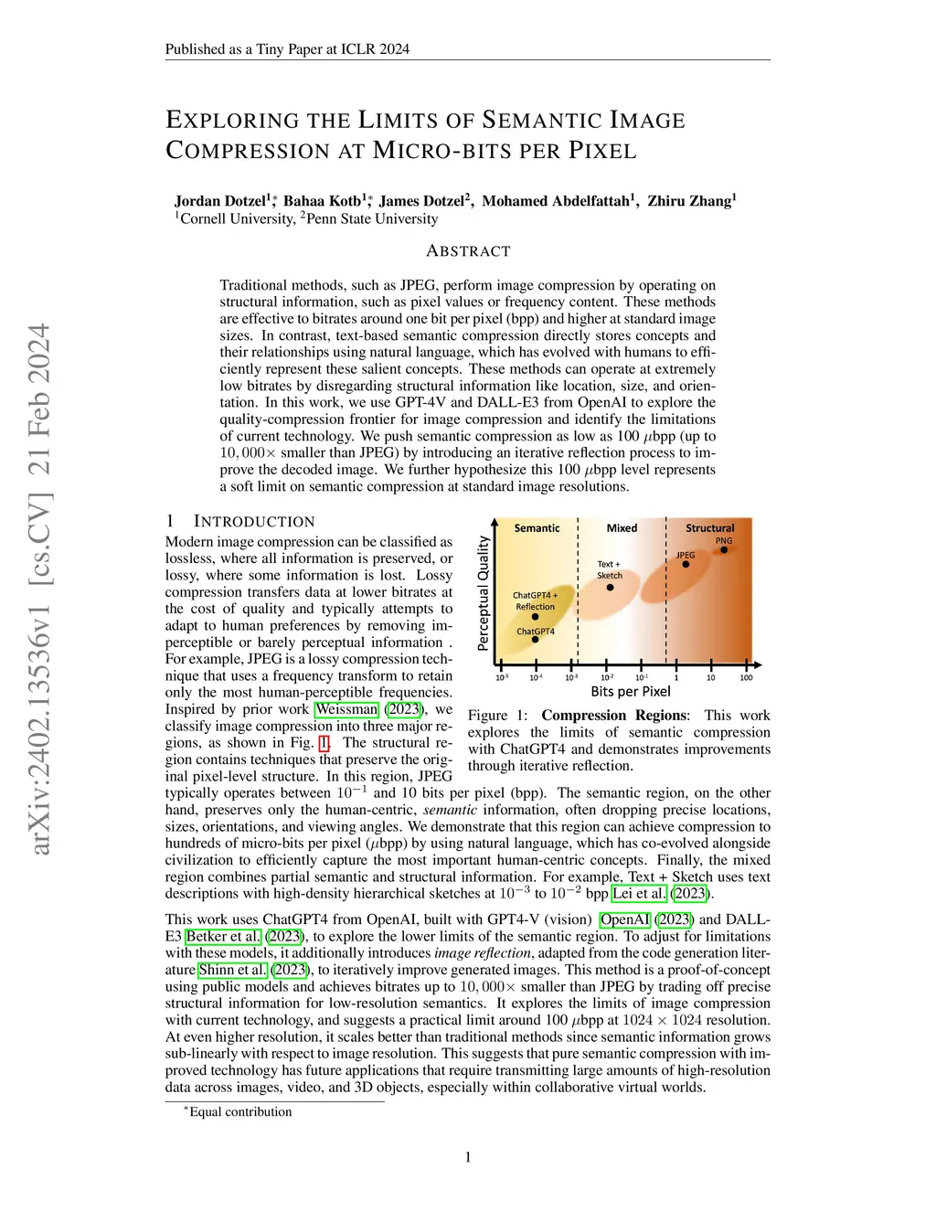 Traditional methods, such as JPEG, perform image compression by operating on structural information, such as pixel values or frequency content. These methods are effective to bitrates around one bit per pixel (bpp) and higher at standard image sizes. In contrast, text-based semantic compression directly stores concepts and their relationships using natural language, which has evolved with humans to efficiently represent these salient concepts. These methods can operate at extremely low bitrates by disregarding structural information like location, size, and orientation. In this work, we use GPT-4V and DALL-E3 from OpenAI to explore the quality-compression frontier for image compression and identify the limitations of current technology. We push semantic compression as low as 100 bpp (up to smaller than JPEG) by introducing an iterative reflection process to improve the decoded image. We further hypothesize this 100 bpp level represents a soft limit on semantic compression at standard image resolutions.