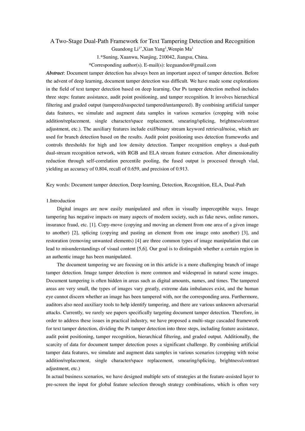 Document tamper detection has always been an important aspect of tamper detection. Before the advent of deep learning, document tamper detection was difficult. We have made some explorations in the field of text tamper detection based on deep learning. Our Ps tamper detection method includes three steps: feature assistance, audit point positioning, and tamper recognition. It involves hierarchical filtering and graded output (tampered/suspected tampered/untampered). By combining artificial tamper data features, we simulate and augment data samples in various scenarios (cropping with noise addition/replacement, single character/space replacement, smearing/splicing, brightness/contrast adjustment, etc.). The auxiliary features include exif/binary stream keyword retrieval/noise, which are used for branch detection based on the results. Audit point positioning uses detection frameworks and controls thresholds for high and low density detection. Tamper recognition employs a dual-path dual-stream recognition network, with RGB and ELA stream feature extraction. After dimensionality reduction through self-correlation percentile pooling, the fused output is processed through vlad, yielding an accuracy of 0.804, recall of 0.659, and precision of 0.913.