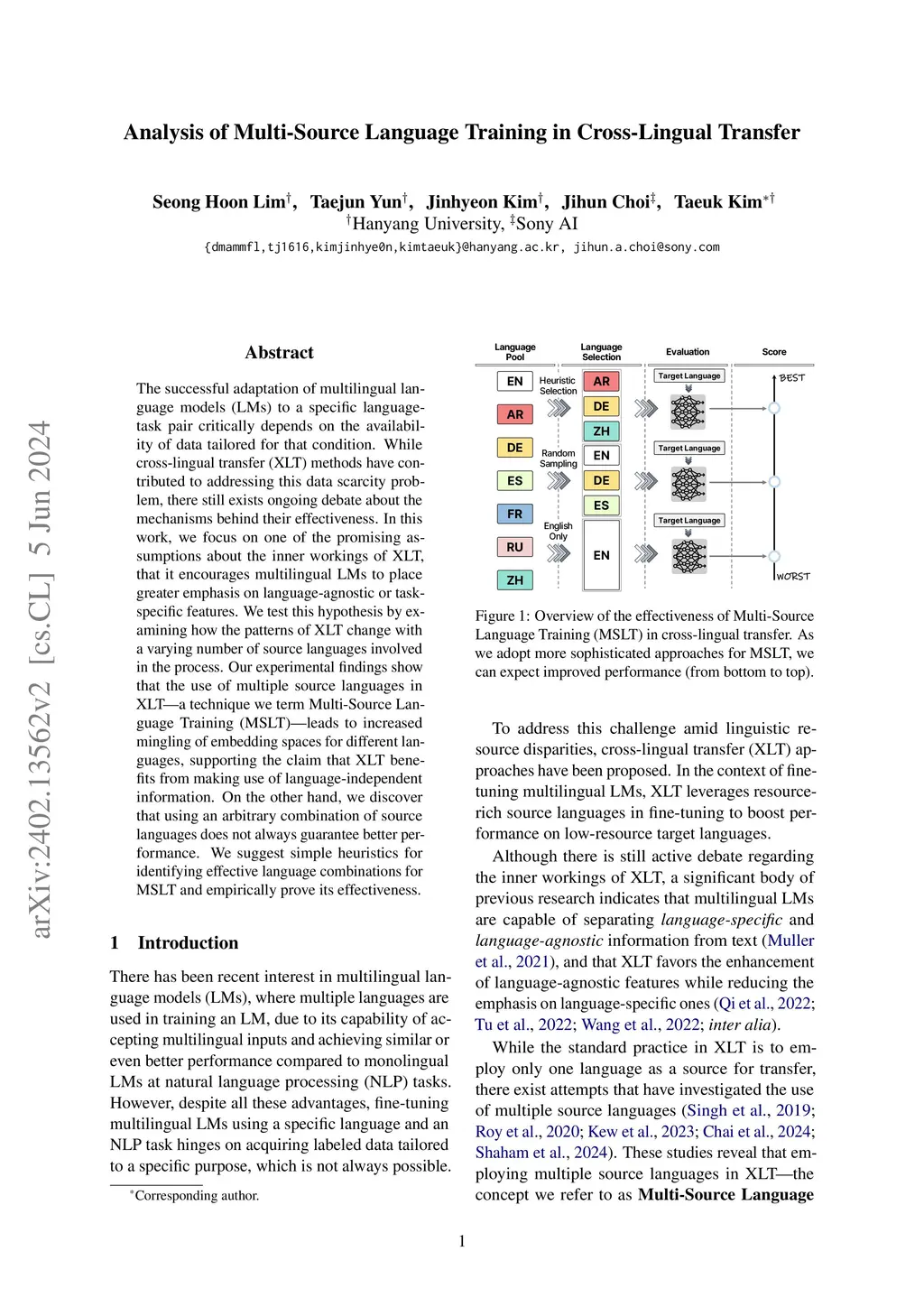 The successful adaptation of multilingual language models (LMs) to a specific language-task pair critically depends on the availability of data tailored for that condition. While cross-lingual transfer (XLT) methods have contributed to addressing this data scarcity problem, there still exists ongoing debate about the mechanisms behind their effectiveness. In this work, we focus on one of promising assumptions about inner workings of XLT, that it encourages multilingual LMs to place greater emphasis on language-agnostic or task-specific features. We test this hypothesis by examining how the patterns of XLT change with a varying number of source languages involved in the process. Our experimental findings show that the use of multiple source languages in XLT-a technique we term Multi-Source Language Training (MSLT)-leads to increased mingling of embedding spaces for different languages, supporting the claim that XLT benefits from making use of language-independent information. On the other hand, we discover that using an arbitrary combination of source languages does not always guarantee better performance. We suggest simple heuristics for identifying effective language combinations for MSLT and empirically prove its effectiveness.