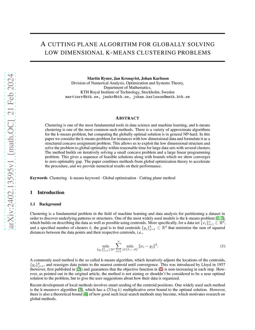 A cutting plane algorithm for globally solving low dimensional k-means
