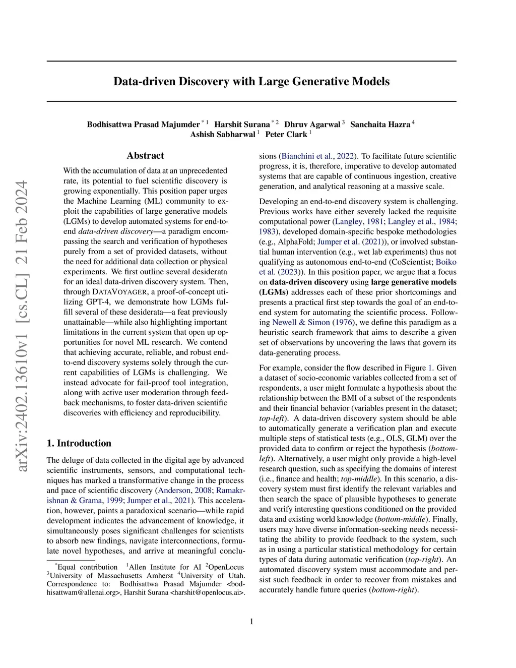 With the accumulation of data at an unprecedented rate, its potential to fuel scientific discovery is growing exponentially. This position paper urges the Machine Learning (ML) community to exploit the capabilities of large generative models (LGMs) to develop automated systems for end-to-end data-driven discovery -- a paradigm encompassing the search and verification of hypotheses purely from a set of provided datasets, without the need for additional data collection or physical experiments. We first outline several desiderata for an ideal data-driven discovery system. Then, through DATAVOYAGER, a proof-of-concept utilizing GPT-4, we demonstrate how LGMs fulfill several of these desiderata -- a feat previously unattainable -- while also highlighting important limitations in the current system that open up opportunities for novel ML research. We contend that achieving accurate, reliable, and robust end-to-end discovery systems solely through the current capabilities of LGMs is challenging. We instead advocate for fail-proof tool integration, along with active user moderation through feedback mechanisms, to foster data-driven scientific discoveries with efficiency and reproducibility.