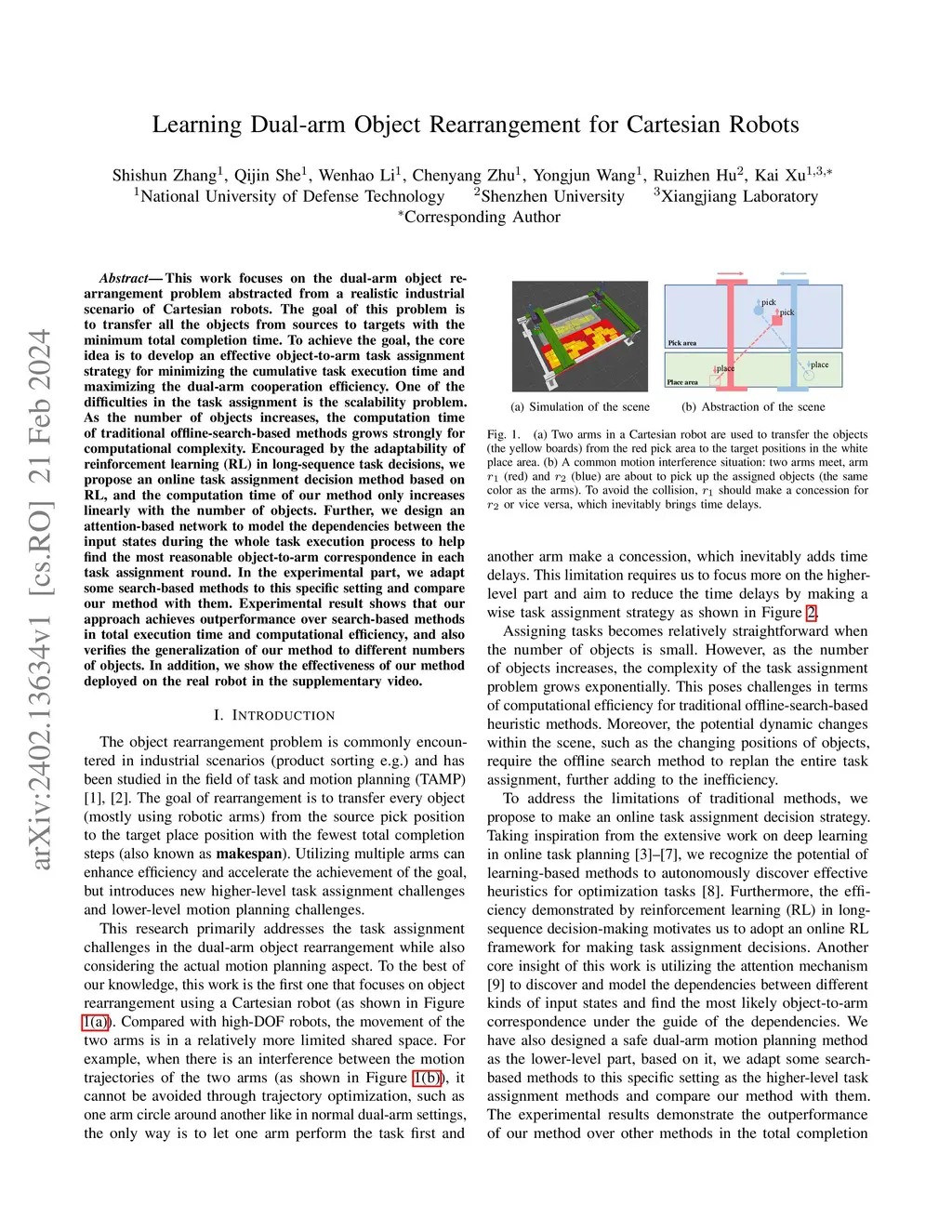 Learning Dual-arm Object Rearrangement for Cartesian Robots