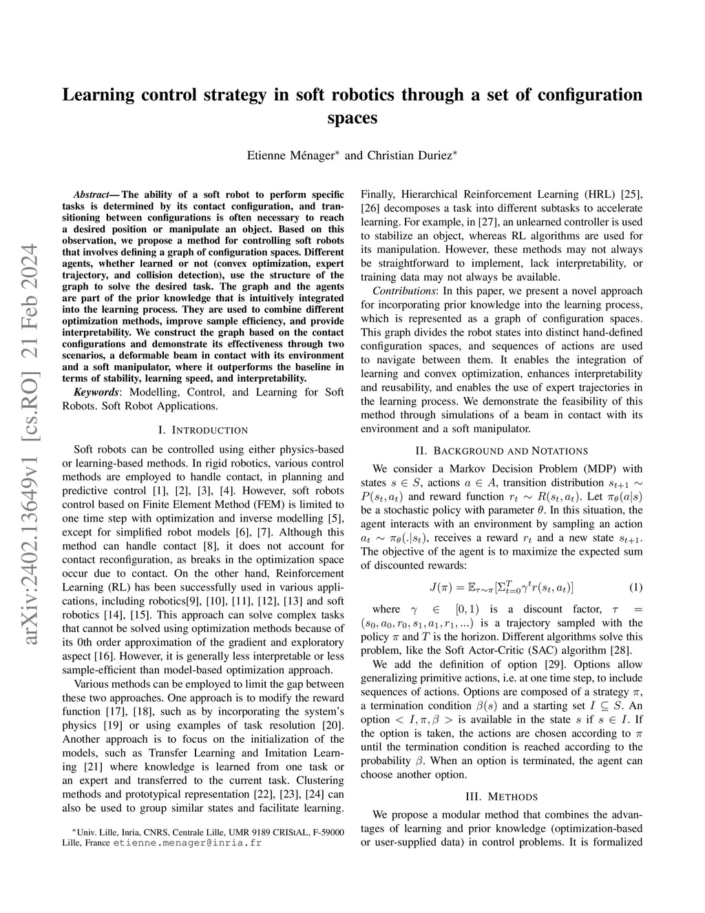 The ability of a soft robot to perform specific tasks is determined by its contact configuration, and transitioning between configurations is often necessary to reach a desired position or manipulate an object. Based on this observation, we propose a method for controlling soft robots that involves defining a graph of configuration spaces. Different agents, whether learned or not (convex optimization, expert trajectory, and collision detection), use the structure of the graph to solve the desired task. The graph and the agents are part of the prior knowledge that is intuitively integrated into the learning process. They are used to combine different optimization methods, improve sample efficiency, and provide interpretability. We construct the graph based on the contact configurations and demonstrate its effectiveness through two scenarios, a deformable beam in contact with its environment and a soft manipulator, where it outperforms the baseline in terms of stability, learning speed, and interpretability.