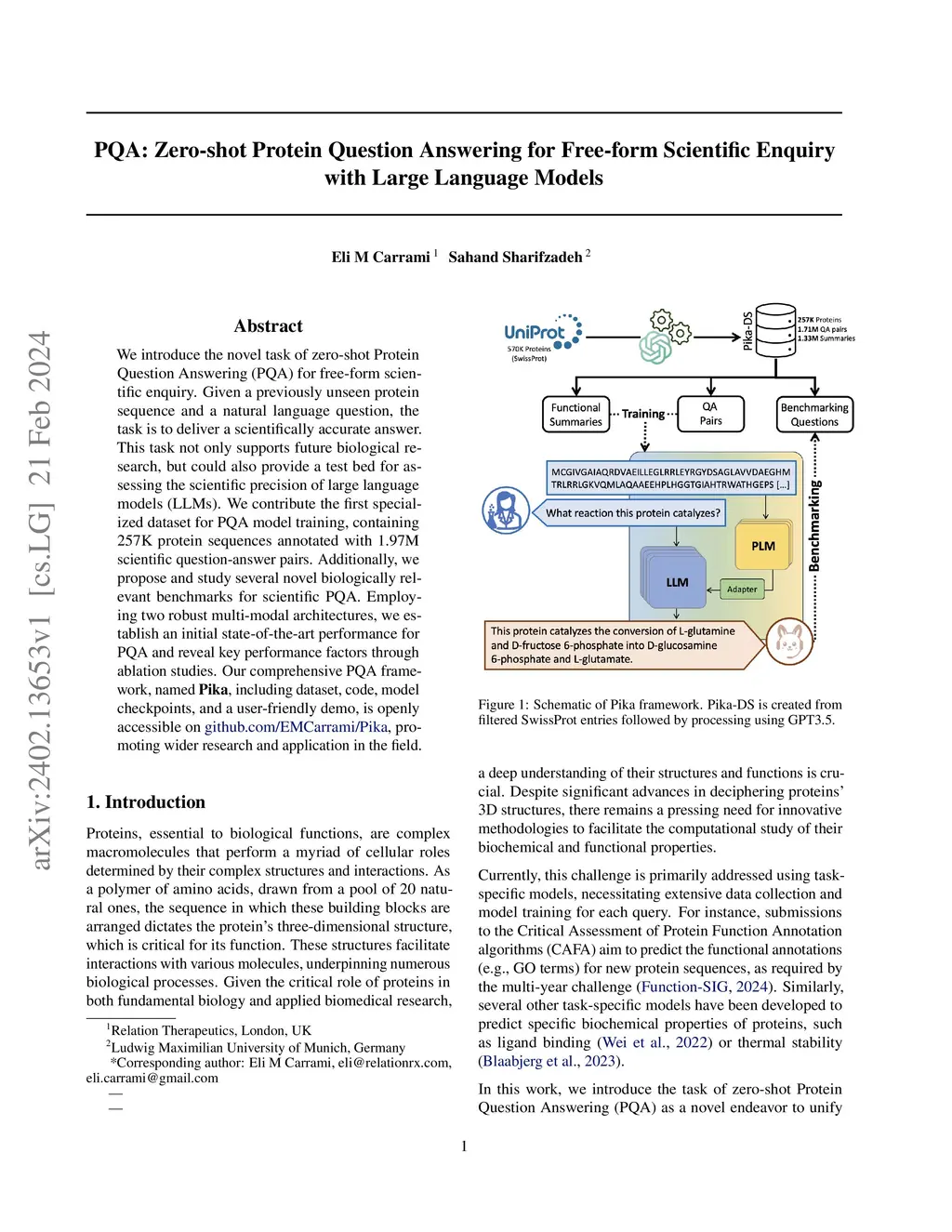 We introduce the novel task of zero-shot Protein Question Answering (PQA) for free-form scientific enquiry. Given a previously unseen protein sequence and a natural language question, the task is to deliver a scientifically accurate answer. This task not only supports future biological research, but could also provide a test bed for assessing the scientific precision of large language models (LLMs). We contribute the first specialized dataset for PQA model training, containing 257K protein sequences annotated with 1.97M scientific question-answer pairs. Additionally, we propose and study several novel biologically relevant benchmarks for scientific PQA. Employing two robust multi-modal architectures, we establish an initial state-of-the-art performance for PQA and reveal key performance factors through ablation studies. Our comprehensive PQA framework, named Pika, including dataset, code, model checkpoints, and a user-friendly demo, is openly accessible on github.com/EMCarrami/Pika, promoting wider research and application in the field.