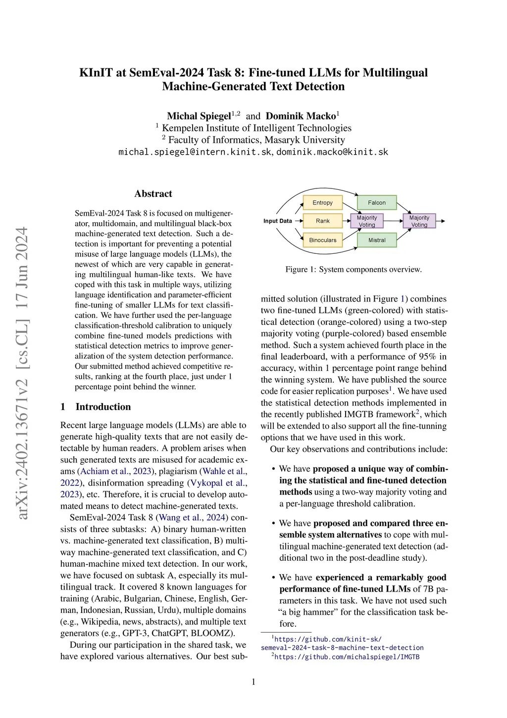 SemEval-2024 Task 8 is focused on multigenerator, multidomain, and multilingual black-box machine-generated text detection. Such a detection is important for preventing a potential misuse of large language models (LLMs), the newest of which are very capable in generating multilingual human-like texts. We have coped with this task in multiple ways, utilizing language identification and parameter-efficient fine-tuning of smaller LLMs for text classification. We have further used the per-language classification-threshold calibration to uniquely combine fine-tuned models predictions with statistical detection metrics to improve generalization of the system detection performance. Our submitted method achieved competitive results, ranking at the fourth place, just under 1 percentage point behind the winner.