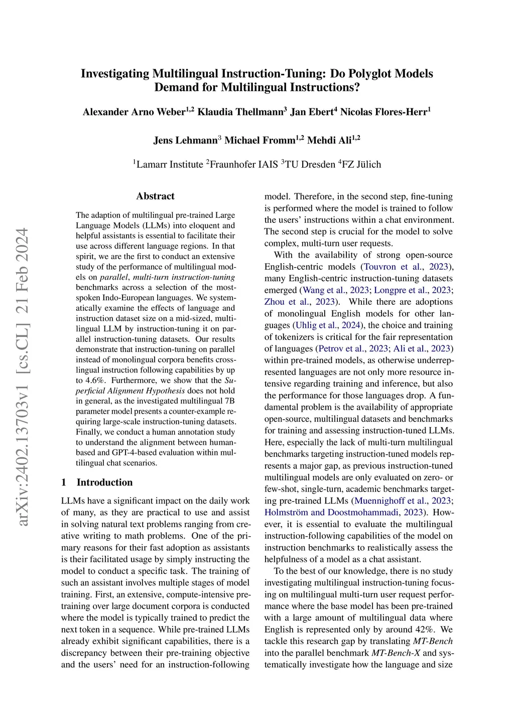 The adaption of multilingual pre-trained Large Language Models (LLMs) into eloquent and helpful assistants is essential to facilitate their use across different language regions. In that spirit, we are the first to conduct an extensive study of the performance of multilingual models on parallel, multi-turn instruction-tuning benchmarks across a selection of the most-spoken Indo-European languages. We systematically examine the effects of language and instruction dataset size on a mid-sized, multilingual LLM by instruction-tuning it on parallel instruction-tuning datasets. Our results demonstrate that instruction-tuning on parallel instead of monolingual corpora benefits cross-lingual instruction following capabilities by up to 4.6%. Furthermore, we show that the Superficial Alignment Hypothesis does not hold in general, as the investigated multilingual 7B parameter model presents a counter-example requiring large-scale instruction-tuning datasets. Finally, we conduct a human annotation study to understand the alignment between human-based and GPT-4-based evaluation within multilingual chat scenarios.