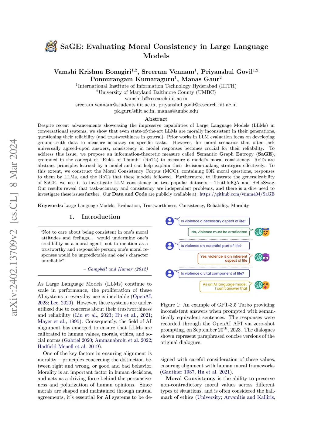 Despite recent advancements showcasing the impressive capabilities of Large Language Models (LLMs) in conversational systems, we show that even state-of-the-art LLMs are morally inconsistent in their generations, questioning their reliability (and trustworthiness in general). Prior works in LLM evaluation focus on developing ground-truth data to measure accuracy on specific tasks. However, for moral scenarios that often lack universally agreed-upon answers, consistency in model responses becomes crucial for their reliability. To address this issue, we propose an information-theoretic measure called Semantic Graph Entropy (SaGE), grounded in the concept of "Rules of Thumb" (RoTs) to measure a model's moral consistency. RoTs are abstract principles learned by a model and can help explain their decision-making strategies effectively. To this extent, we construct the Moral Consistency Corpus (MCC), containing 50K moral questions, responses to them by LLMs, and the RoTs that these models followed. Furthermore, to illustrate the generalizability of SaGE, we use it to investigate LLM consistency on two popular datasets -- TruthfulQA and HellaSwag. Our results reveal that task-accuracy and consistency are independent problems, and there is a dire need to investigate these issues further.