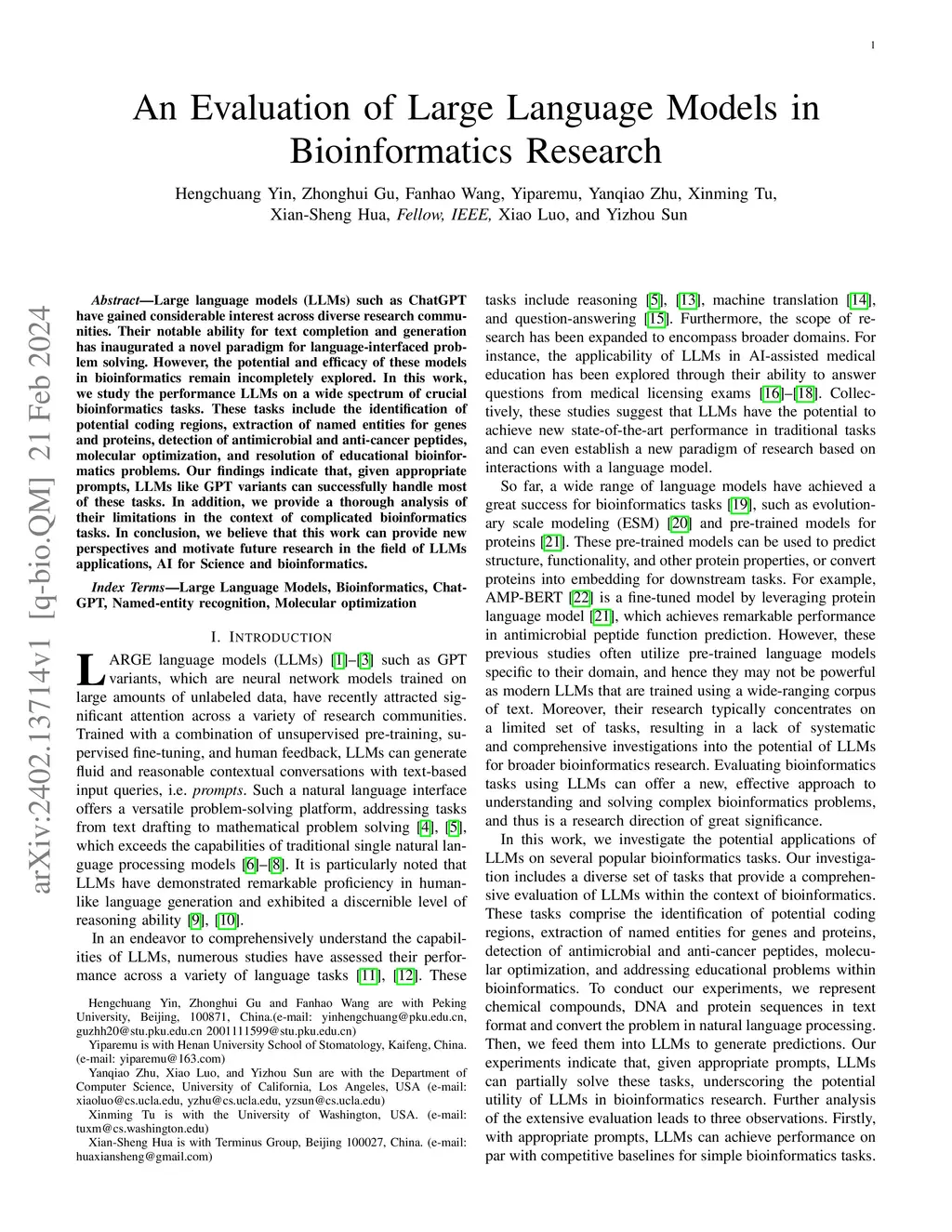 Large language models (LLMs) such as ChatGPT have gained considerable interest across diverse research communities. Their notable ability for text completion and generation has inaugurated a novel paradigm for language-interfaced problem solving. However, the potential and efficacy of these models in bioinformatics remain incompletely explored. In this work, we study the performance LLMs on a wide spectrum of crucial bioinformatics tasks. These tasks include the identification of potential coding regions, extraction of named entities for genes and proteins, detection of antimicrobial and anti-cancer peptides, molecular optimization, and resolution of educational bioinformatics problems. Our findings indicate that, given appropriate prompts, LLMs like GPT variants can successfully handle most of these tasks. In addition, we provide a thorough analysis of their limitations in the context of complicated bioinformatics tasks. In conclusion, we believe that this work can provide new perspectives and motivate future research in the field of LLMs applications, AI for Science and bioinformatics.