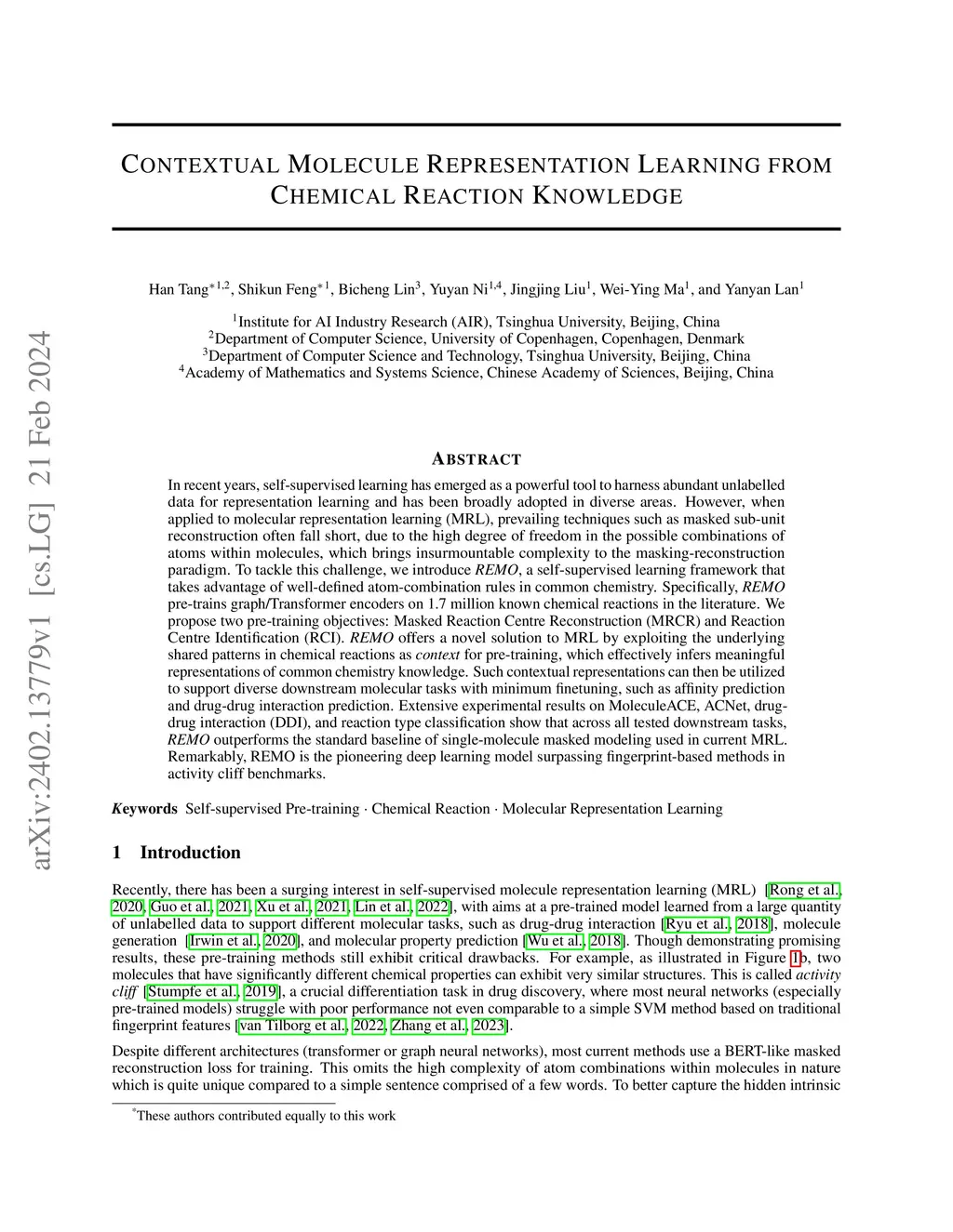 In recent years, self-supervised learning has emerged as a powerful tool to harness abundant unlabelled data for representation learning and has been broadly adopted in diverse areas. However, when applied to molecular representation learning (MRL), prevailing techniques such as masked sub-unit reconstruction often fall short, due to the high degree of freedom in the possible combinations of atoms within molecules, which brings insurmountable complexity to the masking-reconstruction paradigm. To tackle this challenge, we introduce REMO, a self-supervised learning framework that takes advantage of well-defined atom-combination rules in common chemistry. Specifically, REMO pre-trains graph/Transformer encoders on 1.7 million known chemical reactions in the literature. We propose two pre-training objectives: Masked Reaction Centre Reconstruction (MRCR) and Reaction Centre Identification (RCI). REMO offers a novel solution to MRL by exploiting the underlying shared patterns in chemical reactions as \textit{context} for pre-training, which effectively infers meaningful representations of common chemistry knowledge. Such contextual representations can then be utilized to support diverse downstream molecular tasks with minimum finetuning, such as affinity prediction and drug-drug interaction prediction. Extensive experimental results on MoleculeACE, ACNet, drug-drug interaction (DDI), and reaction type classification show that across all tested downstream tasks, REMO outperforms the standard baseline of single-molecule masked modeling used in current MRL. Remarkably, REMO is the pioneering deep learning model surpassing fingerprint-based methods in activity cliff benchmarks.