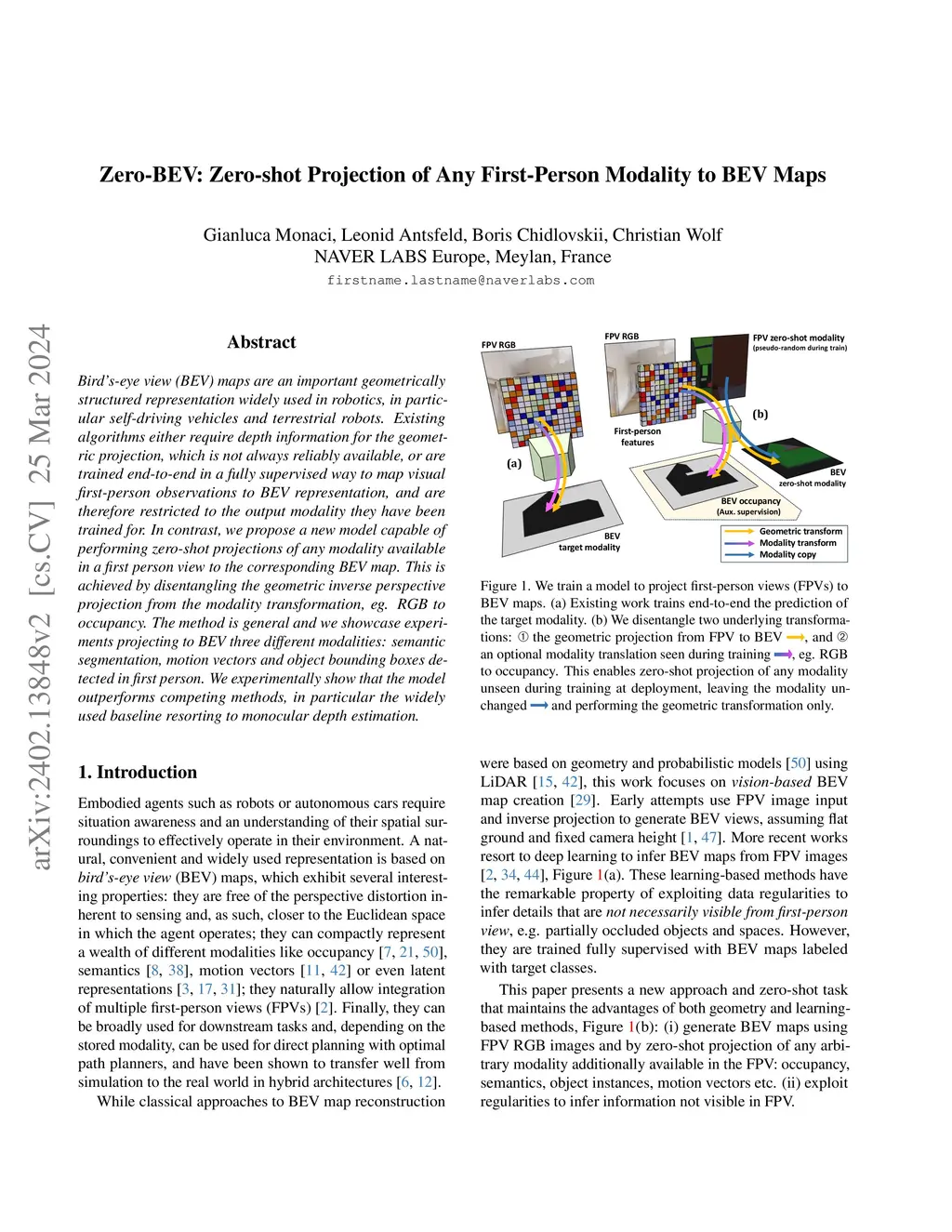 Bird's-eye view (BEV) maps are an important geometrically structured representation widely used in robotics, in particular self-driving vehicles and terrestrial robots. Existing algorithms either require depth information for the geometric projection, which is not always reliably available, or are trained end-to-end in a fully supervised way to map visual first-person observations to BEV representation, and are therefore restricted to the output modality they have been trained for. In contrast, we propose a new model capable of performing zero-shot projections of any modality available in a first person view to the corresponding BEV map. This is achieved by disentangling the geometric inverse perspective projection from the modality transformation, eg. RGB to occupancy. The method is general and we showcase experiments projecting to BEV three different modalities: semantic segmentation, motion vectors and object bounding boxes detected in first person. We experimentally show that the model outperforms competing methods, in particular the widely used baseline resorting to monocular depth estimation.