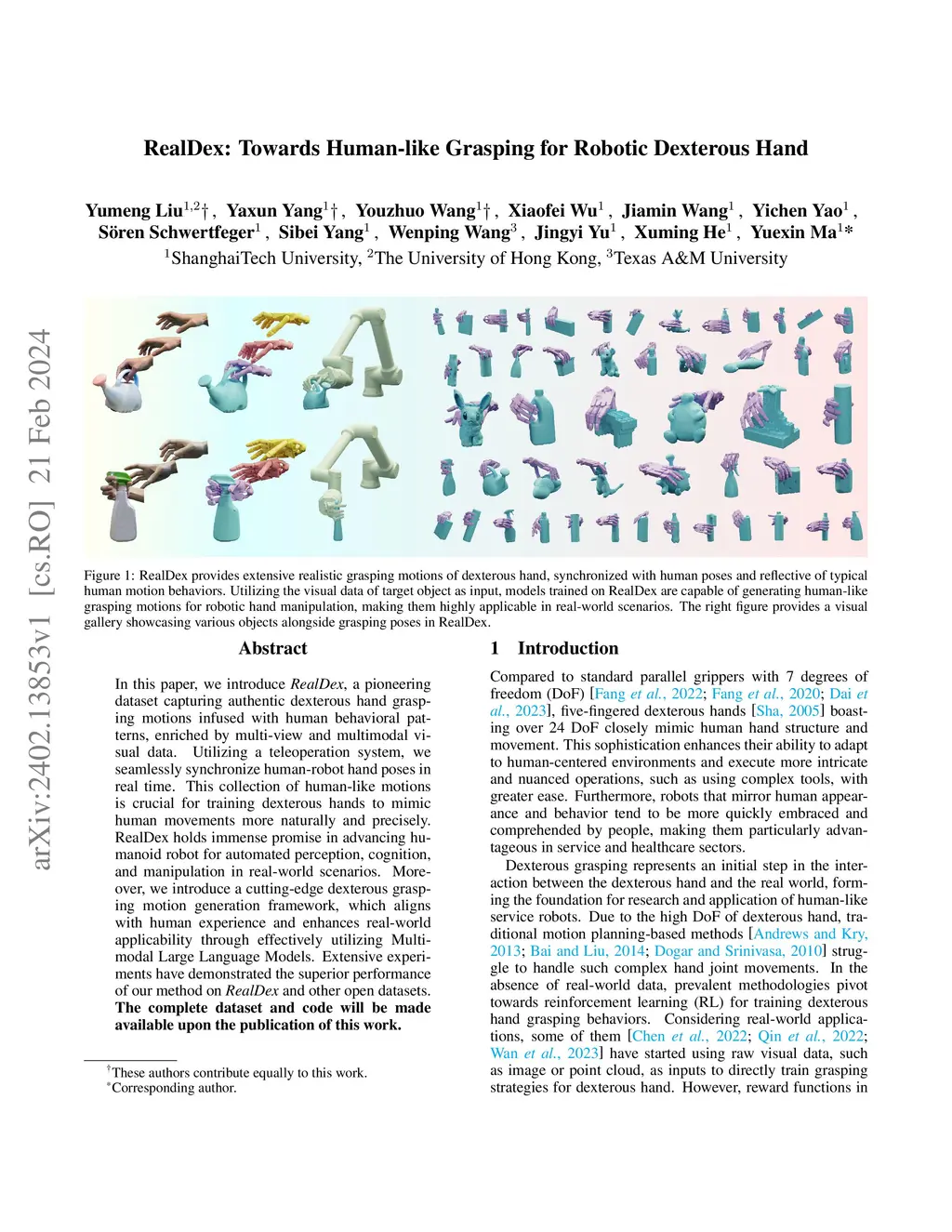 In this paper, we introduce RealDex, a pioneering dataset capturing authentic dexterous hand grasping motions infused with human behavioral patterns, enriched by multi-view and multimodal visual data. Utilizing a teleoperation system, we seamlessly synchronize human-robot hand poses in real time. This collection of human-like motions is crucial for training dexterous hands to mimic human movements more naturally and precisely. RealDex holds immense promise in advancing humanoid robot for automated perception, cognition, and manipulation in real-world scenarios. Moreover, we introduce a cutting-edge dexterous grasping motion generation framework, which aligns with human experience and enhances real-world applicability through effectively utilizing Multimodal Large Language Models. Extensive experiments have demonstrated the superior performance of our method on RealDex and other open datasets. The complete dataset and code will be made available upon the publication of this work.