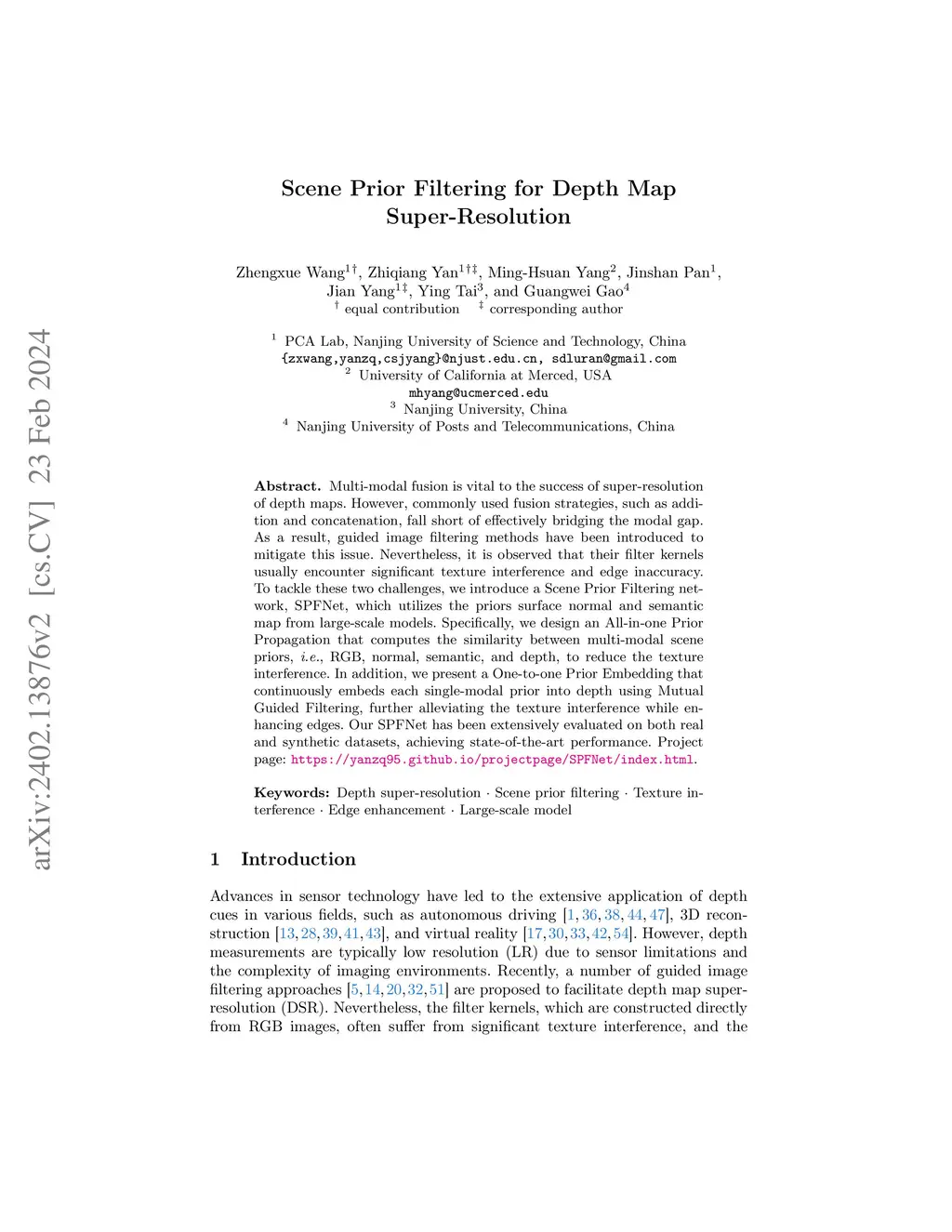 Multi-modal fusion serves as a cornerstone for successful depth map super-resolution. However, commonly used fusion strategies, such as addition and concatenation, fall short of effectively bridging the modal gap. As a result, guided image filtering methods have been introduced to mitigate this issue. Nevertheless, it is observed that their filter kernels usually encounter significant texture interference and edge inaccuracy. To tackle these two challenges, we introduce a Scene Prior Filtering network, SPFNet, which utilizes the priors' surface normal and semantic map from large-scale models. Specifically, we propose an All-in-one Prior Propagation that computes similarity between multi-modal scene priors, i.e., RGB, normal, semantic, and depth, to reduce the texture interference. Besides, we design a One-to-one Prior Embedding that continuously embeds every single modal prior into depth using Mutual Guided Filtering, further alleviating texture interference while enhancing edge representations. Our SPFNet has been extensively evaluated on both real-world and synthetic datasets, achieving state-of-the-art performance.