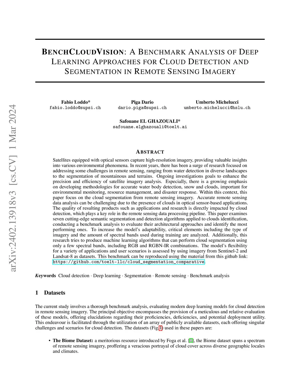 Satellites equipped with optical sensors capture high-resolution imagery, providing valuable insights into various environmental phenomena. In recent years, there has been a surge of research focused on addressing some challenges in remote sensing, ranging from water detection in diverse landscapes to the segmentation of mountainous and terrains. Ongoing investigations goals to enhance the precision and efficiency of satellite imagery analysis. Especially, there is a growing emphasis on developing methodologies for accurate water body detection, snow and clouds, important for environmental monitoring, resource management, and disaster response. Within this context, this paper focus on the cloud segmentation from remote sensing imagery. Accurate remote sensing data analysis can be challenging due to the presence of clouds in optical sensor-based applications. The quality of resulting products such as applications and research is directly impacted by cloud detection, which plays a key role in the remote sensing data processing pipeline. This paper examines seven cutting-edge semantic segmentation and detection algorithms applied to clouds identification, conducting a benchmark analysis to evaluate their architectural approaches and identify the most performing ones. To increase the model's adaptability, critical elements including the type of imagery and the amount of spectral bands used during training are analyzed. Additionally, this research tries to produce machine learning algorithms that can perform cloud segmentation using only a few spectral bands, including RGB and RGBN-IR combinations. The model's flexibility for a variety of applications and user scenarios is assessed by using imagery from Sentinel-2 and Landsat-8 as datasets. This benchmark can be reproduced using the material from this github link: https://github.com/toelt-llc/cloud_segmentation_comparative.
