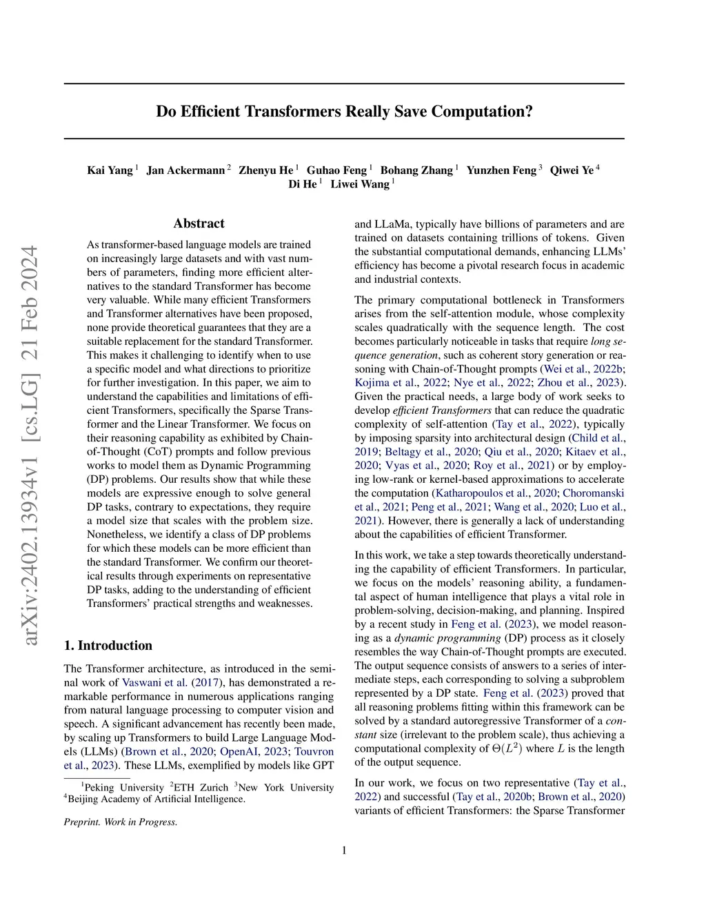 As transformer-based language models are trained on increasingly large datasets and with vast numbers of parameters, finding more efficient alternatives to the standard Transformer has become very valuable. While many efficient Transformers and Transformer alternatives have been proposed, none provide theoretical guarantees that they are a suitable replacement for the standard Transformer. This makes it challenging to identify when to use a specific model and what directions to prioritize for further investigation. In this paper, we aim to understand the capabilities and limitations of efficient Transformers, specifically the Sparse Transformer and the Linear Transformer. We focus on their reasoning capability as exhibited by Chain-of-Thought (CoT) prompts and follow previous works to model them as Dynamic Programming (DP) problems. Our results show that while these models are expressive enough to solve general DP tasks, contrary to expectations, they require a model size that scales with the problem size. Nonetheless, we identify a class of DP problems for which these models can be more efficient than the standard Transformer. We confirm our theoretical results through experiments on representative DP tasks, adding to the understanding of efficient Transformers' practical strengths and weaknesses.