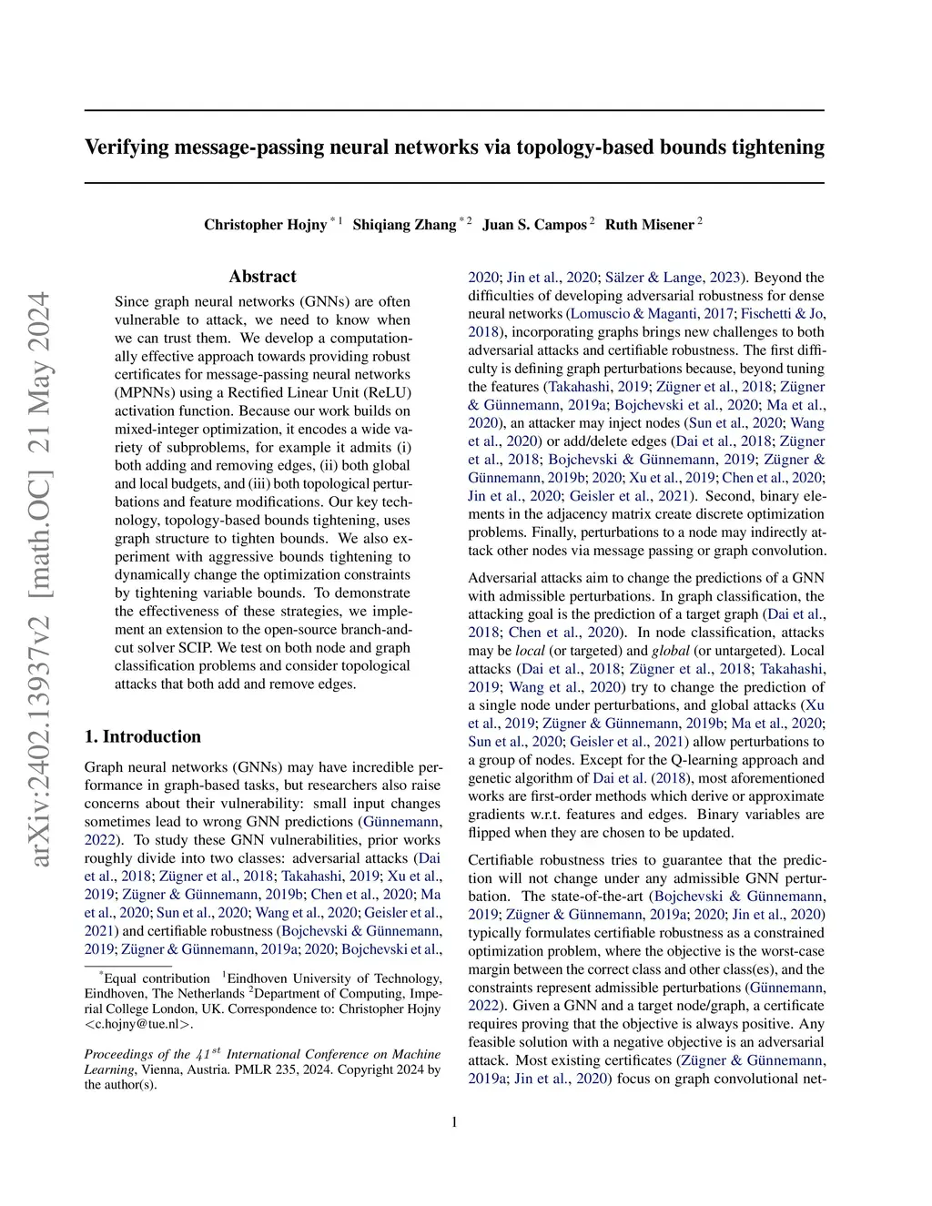 Since graph neural networks (GNNs) are often vulnerable to attack, we need to know when we can trust them. We develop a computationally effective approach towards providing robust certificates for message-passing neural networks (MPNNs) using a Rectified Linear Unit (ReLU) activation function. Because our work builds on mixed-integer optimization, it encodes a wide variety of subproblems, for example it admits (i) both adding and removing edges, (ii) both global and local budgets, and (iii) both topological perturbations and feature modifications. Our key technology, topology-based bounds tightening, uses graph structure to tighten bounds. We also experiment with aggressive bounds tightening to dynamically change the optimization constraints by tightening variable bounds. To demonstrate the effectiveness of these strategies, we implement an extension to the open-source branch-and-cut solver SCIP. We test on both node and graph classification problems and consider topological attacks that both add and remove edges.