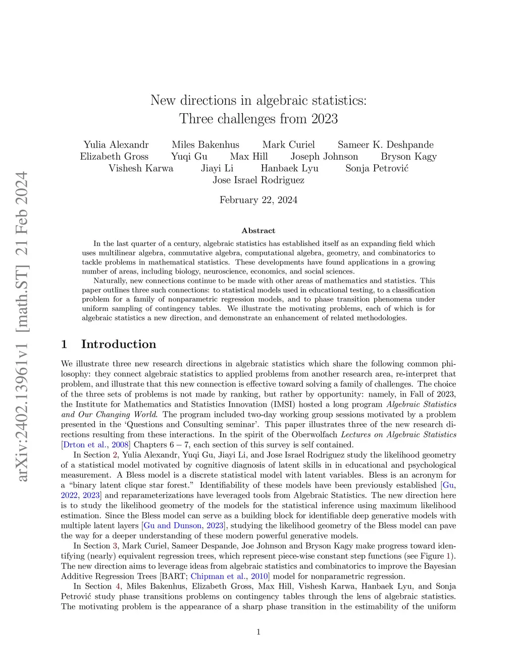 In the last quarter of a century, algebraic statistics has established itself as an expanding field which uses multilinear algebra, commutative algebra, computational algebra, geometry, and combinatorics to tackle problems in mathematical statistics. These developments have found applications in a growing number of areas, including biology, neuroscience, economics, and social sciences. Naturally, new connections continue to be made with other areas of mathematics and statistics. This paper outlines three such connections: to statistical models used in educational testing, to a classification problem for a family of nonparametric regression models, and to phase transition phenomena under uniform sampling of contingency tables. We illustrate the motivating problems, each of which is for algebraic statistics a new direction, and demonstrate an enhancement of related methodologies.