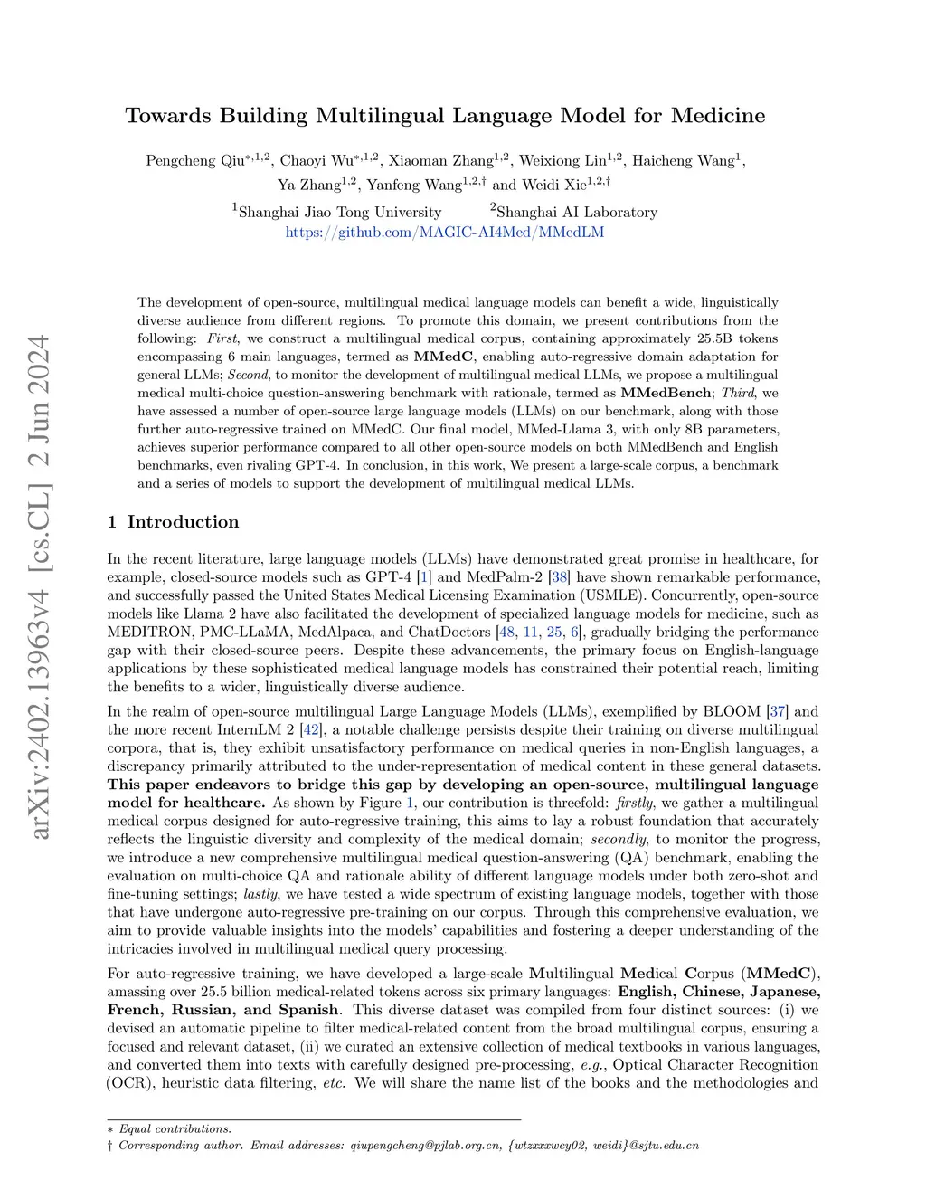 The development of open-source, multilingual medical language models can benefit a wide, linguistically diverse audience from different regions. To promote this domain, we present contributions from the following: First, we construct a multilingual medical corpus, containing approximately 25.5B tokens encompassing 6 main languages, termed as MMedC, enabling auto-regressive domain adaptation for general LLMs; Second, to monitor the development of multilingual medical LLMs, we propose a multilingual medical multi-choice question-answering benchmark with rationale, termed as MMedBench; Third, we have assessed a number of open-source large language models (LLMs) on our benchmark, along with those further auto-regressive trained on MMedC. Our final model, MMed-Llama 3, with only 8B parameters, achieves superior performance compared to all other open-source models on both MMedBench and English benchmarks, even rivaling GPT-4. In conclusion, in this work, we present a large-scale corpus, a benchmark and a series of models to support the development of multilingual medical LLMs.