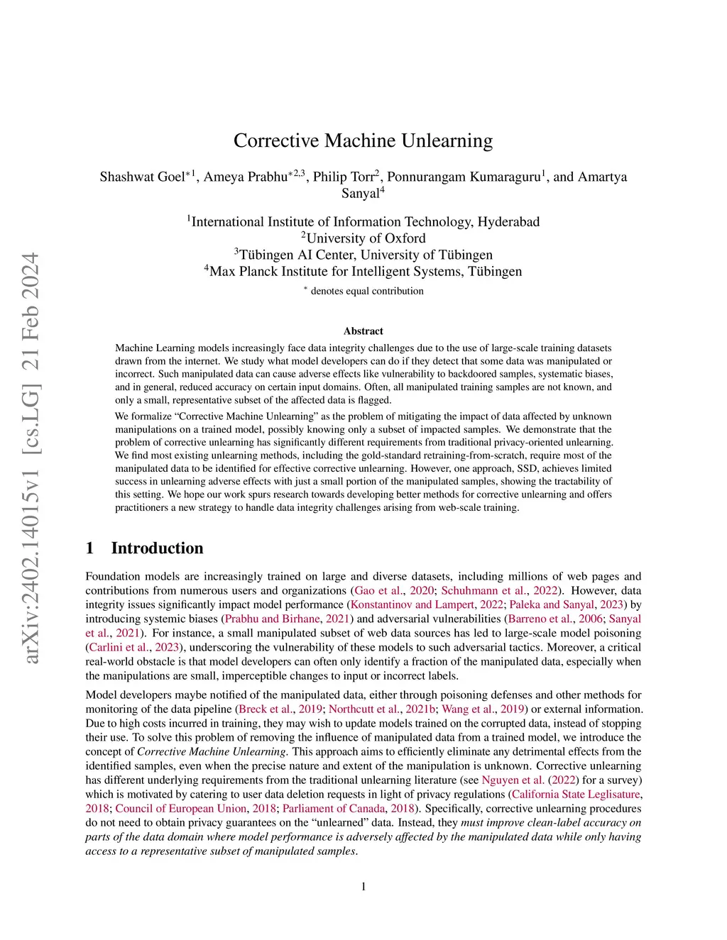 Machine Learning models increasingly face data integrity challenges due to the use of large-scale training datasets drawn from the internet. We study what model developers can do if they detect that some data was manipulated or incorrect. Such manipulated data can cause adverse effects like vulnerability to backdoored samples, systematic biases, and in general, reduced accuracy on certain input domains. Often, all manipulated training samples are not known, and only a small, representative subset of the affected data is flagged. We formalize "Corrective Machine Unlearning" as the problem of mitigating the impact of data affected by unknown manipulations on a trained model, possibly knowing only a subset of impacted samples. We demonstrate that the problem of corrective unlearning has significantly different requirements from traditional privacy-oriented unlearning. We find most existing unlearning methods, including the gold-standard retraining-from-scratch, require most of the manipulated data to be identified for effective corrective unlearning. However, one approach, SSD, achieves limited success in unlearning adverse effects with just a small portion of the manipulated samples, showing the tractability of this setting. We hope our work spurs research towards developing better methods for corrective unlearning and offers practitioners a new strategy to handle data integrity challenges arising from web-scale training.