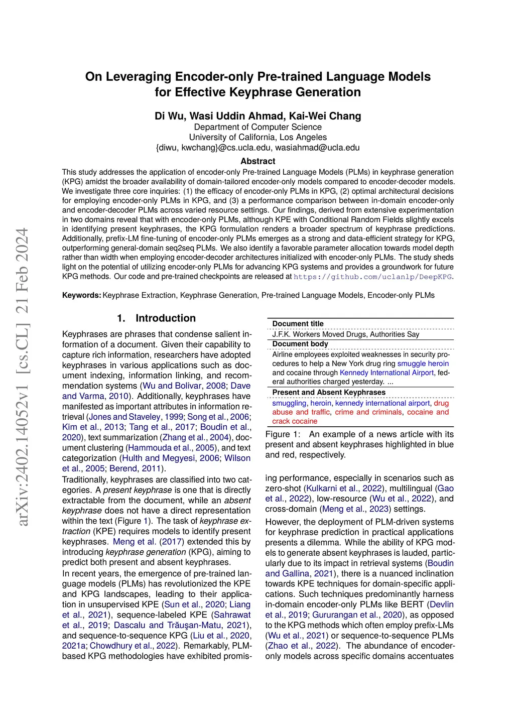 This study addresses the application of encoder-only Pre-trained Language Models (PLMs) in keyphrase generation (KPG) amidst the broader availability of domain-tailored encoder-only models compared to encoder-decoder models. We investigate three core inquiries: (1) the efficacy of encoder-only PLMs in KPG, (2) optimal architectural decisions for employing encoder-only PLMs in KPG, and (3) a performance comparison between in-domain encoder-only and encoder-decoder PLMs across varied resource settings. Our findings, derived from extensive experimentation in two domains reveal that with encoder-only PLMs, although KPE with Conditional Random Fields slightly excels in identifying present keyphrases, the KPG formulation renders a broader spectrum of keyphrase predictions. Additionally, prefix-LM fine-tuning of encoder-only PLMs emerges as a strong and data-efficient strategy for KPG, outperforming general-domain seq2seq PLMs. We also identify a favorable parameter allocation towards model depth rather than width when employing encoder-decoder architectures initialized with encoder-only PLMs. The study sheds light on the potential of utilizing encoder-only PLMs for advancing KPG systems and provides a groundwork for future KPG methods. Our code and pre-trained checkpoints are released at https://github.com/uclanlp/DeepKPG.