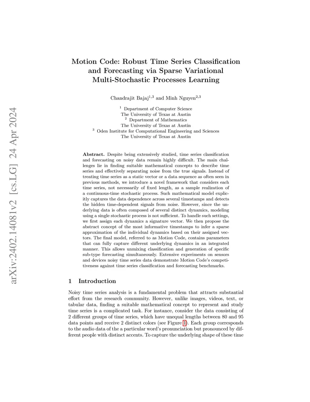 Despite being extensively studied, time series classification and forecasting on noisy data remain highly difficult. The main challenges lie in finding suitable mathematical concepts to describe time series and effectively separating noise from the true signals. Instead of treating time series as a static vector or a data sequence as often seen in previous methods, we introduce a novel framework that considers each time series, not necessarily of fixed length, as a sample realization of a continuous-time stochastic process. Such mathematical model explicitly captures the data dependence across several timestamps and detects the hidden time-dependent signals from noise. However, since the underlying data is often composed of several distinct dynamics, modeling using a single stochastic process is not sufficient. To handle such settings, we first assign each dynamics a signature vector. We then propose the abstract concept of the most informative timestamps to infer a sparse approximation of the individual dynamics based on their assigned vectors. The final model, referred to as Motion Code, contains parameters that can fully capture different underlying dynamics in an integrated manner. This allows unmixing classification and generation of specific sub-type forecasting simultaneously. Extensive experiments on sensors and devices noisy time series data demonstrate Motion Code's competitiveness against time series classification and forecasting benchmarks.