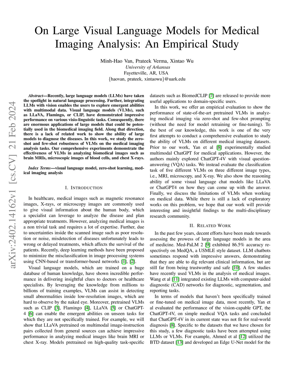Recently, large language models (LLMs) have taken the spotlight in natural language processing. Further, integrating LLMs with vision enables the users to explore emergent abilities with multimodal data. Visual language models (VLMs), such as LLaVA, Flamingo, or CLIP, have demonstrated impressive performance on various visio-linguistic tasks. Consequently, there are enormous applications of large models that could be potentially used in the biomedical imaging field. Along that direction, there is a lack of related work to show the ability of large models to diagnose the diseases. In this work, we study the zero-shot and few-shot robustness of VLMs on the medical imaging analysis tasks. Our comprehensive experiments demonstrate the effectiveness of VLMs in analyzing biomedical images such as brain MRIs, microscopic images of blood cells, and chest X-rays.