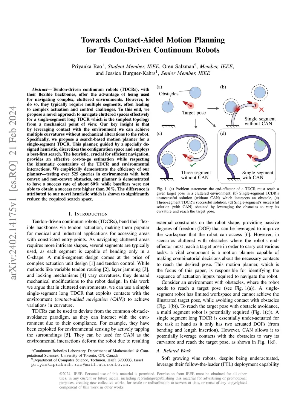 Tendon-driven continuum robots (TDCRs), with their flexible backbones, offer the advantage of being used for navigating complex, cluttered environments. However, to do so, they typically require multiple segments, often leading to complex actuation and control challenges. To this end, we propose a novel approach to navigate cluttered spaces effectively for a single-segment long TDCR which is the simplest topology from a mechanical point of view. Our key insight is that by leveraging contact with the environment we can achieve multiple curvatures without mechanical alterations to the robot. Specifically, we propose a search-based motion planner for a single-segment TDCR. This planner, guided by a specially designed heuristic, discretizes the configuration space and employs a best-first search. The heuristic, crucial for efficient navigation, provides an effective cost-to-go estimation while respecting the kinematic constraints of the TDCR and environmental interactions. We empirically demonstrate the efficiency of our planner-testing over 525 queries in environments with both convex and non-convex obstacles, our planner is demonstrated to have a success rate of about 80% while baselines were not able to obtain a success rate higher than 30%. The difference is attributed to our novel heuristic which is shown to significantly reduce the required search space.