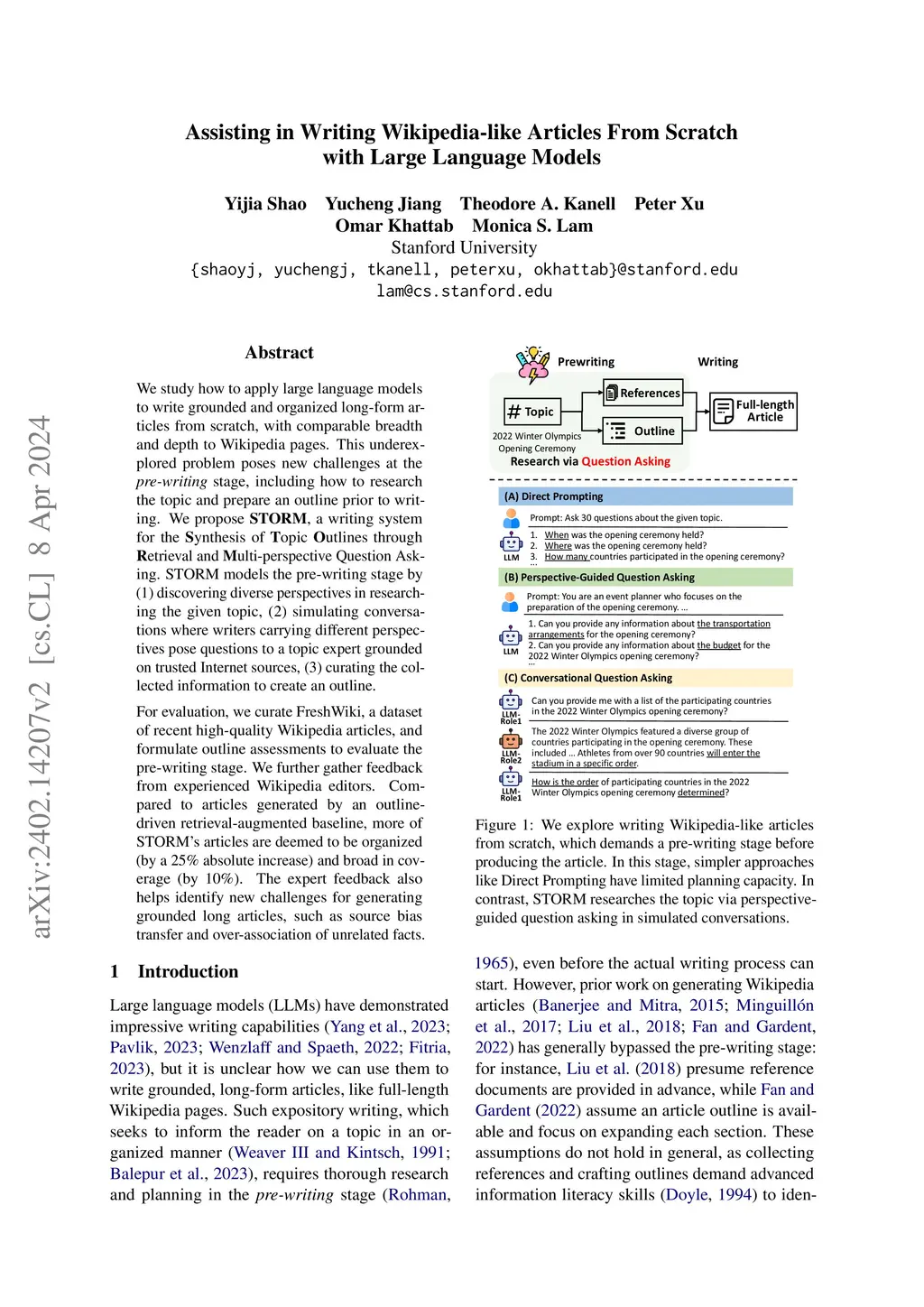 We study how to apply large language models to write grounded and organized long-form articles from scratch, with comparable breadth and depth to Wikipedia pages. This underexplored problem poses new challenges at the pre-writing stage, including how to research the topic and prepare an outline prior to writing. We propose STORM, a writing system for the Synthesis of Topic Outlines through Retrieval and Multi-perspective Question Asking. STORM models the pre-writing stage by (1) discovering diverse perspectives in researching the given topic, (2) simulating conversations where writers carrying different perspectives pose questions to a topic expert grounded on trusted Internet sources, (3) curating the collected information to create an outline. For evaluation, we curate FreshWiki, a dataset of recent high-quality Wikipedia articles, and formulate outline assessments to evaluate the pre-writing stage. We further gather feedback from experienced Wikipedia editors. Compared to articles generated by an outline-driven retrieval-augmented baseline, more of STORM's articles are deemed to be organized (by a 25% absolute increase) and broad in coverage (by 10%). The expert feedback also helps identify new challenges for generating grounded long articles, such as source bias transfer and over-association of unrelated facts.