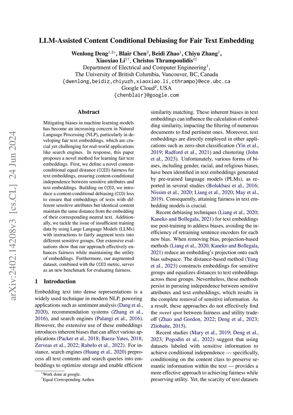 LLM-Assisted Content Conditional Debiasing for Fair Text Embedding