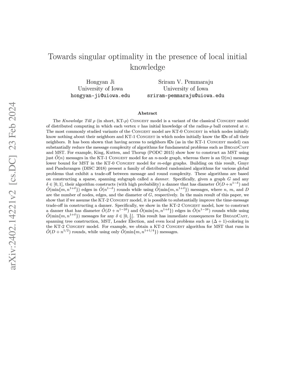 The Knowledge Till rho CONGEST model is a variant of the classical CONGEST model of distributed computing in which each vertex v has initial knowledge of the radius-rho ball centered at v. The most commonly studied variants of the CONGEST model are KT0 CONGEST in which nodes initially know nothing about their neighbors and KT1 CONGEST in which nodes initially know the IDs of all their neighbors. It has been shown that having access to neighbors' IDs (as in the KT1 CONGEST model) can substantially reduce the message complexity of algorithms for fundamental problems such as BROADCAST and MST. For example, King, Kutten, and Thorup (PODC 2015) show how to construct an MST using just Otilde(n) messages in the KT1 CONGEST model, whereas there is an Omega(m) message lower bound for MST in the KT0 CONGEST model. Building on this result, Gmyr and Pandurangen (DISC 2018) present a family of distributed randomized algorithms for various global problems that exhibit a trade-off between message and round complexity. These algorithms are based on constructing a sparse, spanning subgraph called a danner. Specifically, given a graph G and any delta in [0,1], their algorithm constructs (with high probability) a danner that has diameter Otilde(D + n^{1-delta}) and Otilde(min{m,n^{1+delta}}) edges in Otilde(n^{1-delta}) rounds while using Otilde(min{m,n^{1+\delta}}) messages, where n, m, and D are the number of nodes, edges, and the diameter of G, respectively. In the main result of this paper, we show that if we assume the KT2 CONGEST model, it is possible to substantially improve the time-message trade-off in constructing a danner. Specifically, we show in the KT2 CONGEST model, how to construct a danner that has diameter Otilde(D + n^{1-2delta}) and Otilde(min{m,n^{1+delta}}) edges in Otilde(n^{1-2delta}) rounds while using Otilde(min{m,n^{1+\delta}}) messages for any delta in [0,1/2].