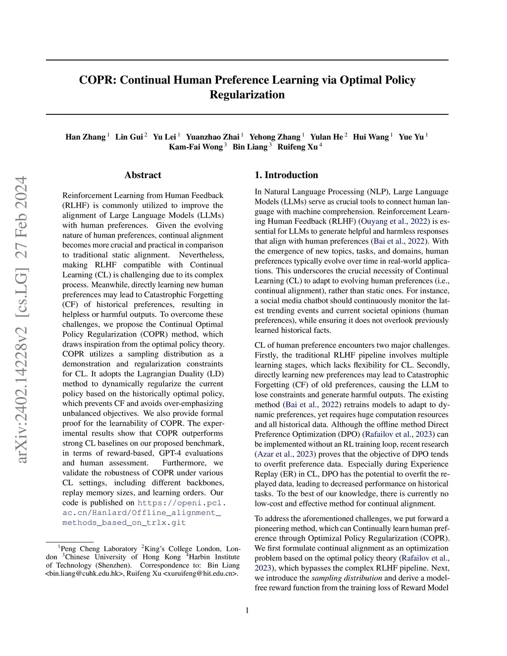 COPR: Continual Human Preference Learning via Optimal Policy