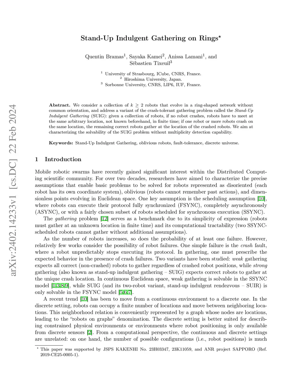 We consider a collection of robots that evolve in a ring-shaped network without common orientation, and address a variant of the crash-tolerant gathering problem called the \emph{Stand-Up Indulgent Gathering} (SUIG): given a collection of robots, if no robot crashes, robots have to meet at the same arbitrary location, not known beforehand, in finite time; if one robot or more robots crash on the same location, the remaining correct robots gather at the location of the crashed robots. We aim at characterizing the solvability of the SUIG problem without multiplicity detection capability.