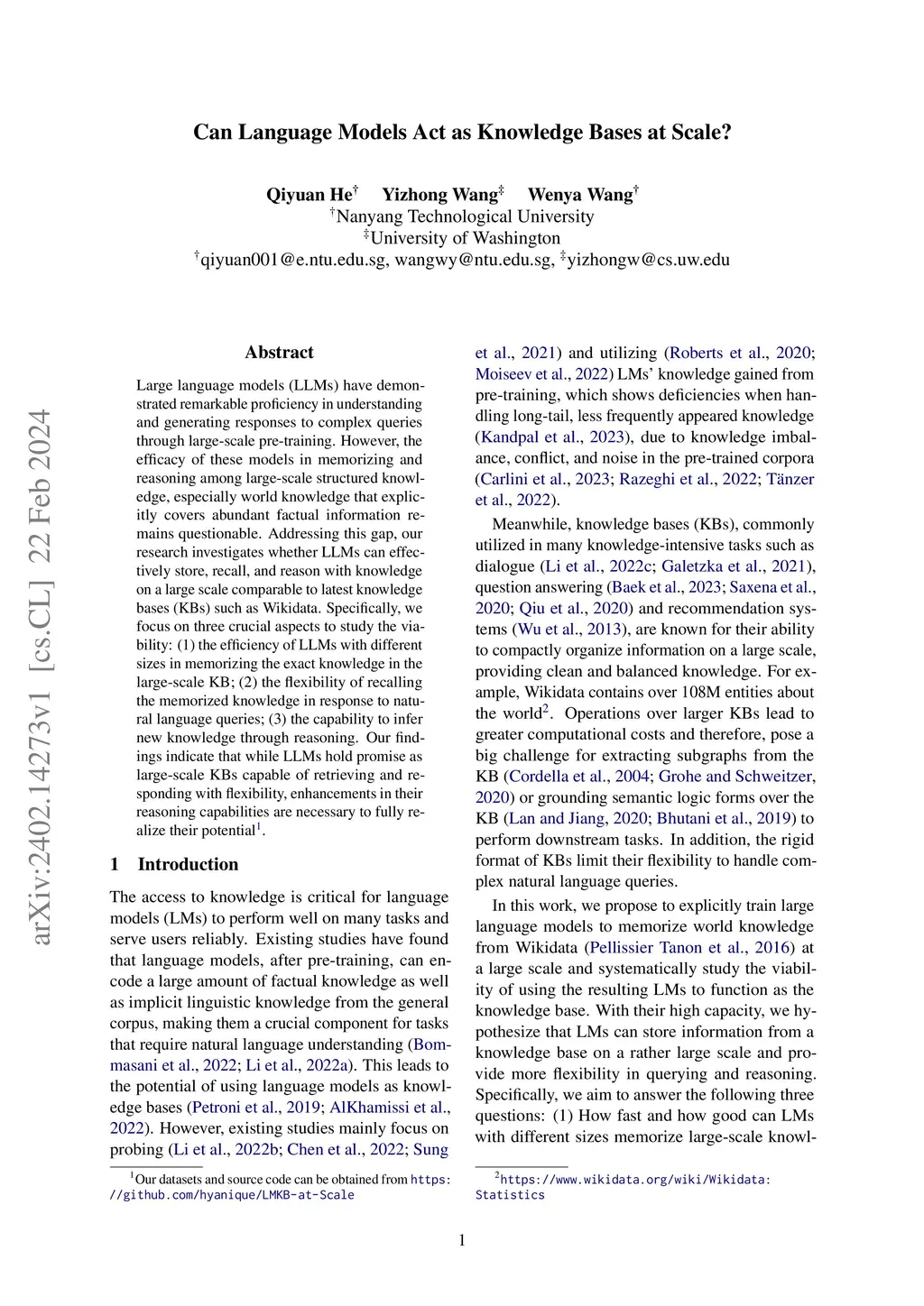 Large language models (LLMs) have demonstrated remarkable proficiency in understanding and generating responses to complex queries through large-scale pre-training. However, the efficacy of these models in memorizing and reasoning among large-scale structured knowledge, especially world knowledge that explicitly covers abundant factual information remains questionable. Addressing this gap, our research investigates whether LLMs can effectively store, recall, and reason with knowledge on a large scale comparable to latest knowledge bases (KBs) such as Wikidata. Specifically, we focus on three crucial aspects to study the viability: (1) the efficiency of LLMs with different sizes in memorizing the exact knowledge in the large-scale KB; (2) the flexibility of recalling the memorized knowledge in response to natural language queries; (3) the capability to infer new knowledge through reasoning. Our findings indicate that while LLMs hold promise as large-scale KBs capable of retrieving and responding with flexibility, enhancements in their reasoning capabilities are necessary to fully realize their potential.