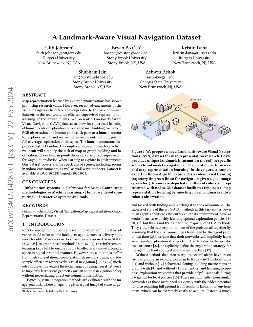 Map representations learned by expert demonstrations have shown promising research value. However, the field of visual navigation still faces challenges due to the lack of real-world human-navigation datasets that can support efficient, supervised, representation learning of environments. We present a Landmark-Aware Visual Navigation (LAVN) dataset to allow for supervised learning of human-centric exploration policies and map building. We collect RGBD observation and human point-click pairs as a human annotator explores virtual and real-world environments with the goal of full coverage exploration of the space. The human annotators also provide distinct landmark examples along each trajectory, which we intuit will simplify the task of map or graph building and localization. These human point-clicks serve as direct supervision for waypoint prediction when learning to explore in environments. Our dataset covers a wide spectrum of scenes, including rooms in indoor environments, as well as walkways outdoors. We release our dataset with detailed documentation atthis https URL(DOI:https://doi.org/10.57967/hf/2386) and a plan for long-term preservation.