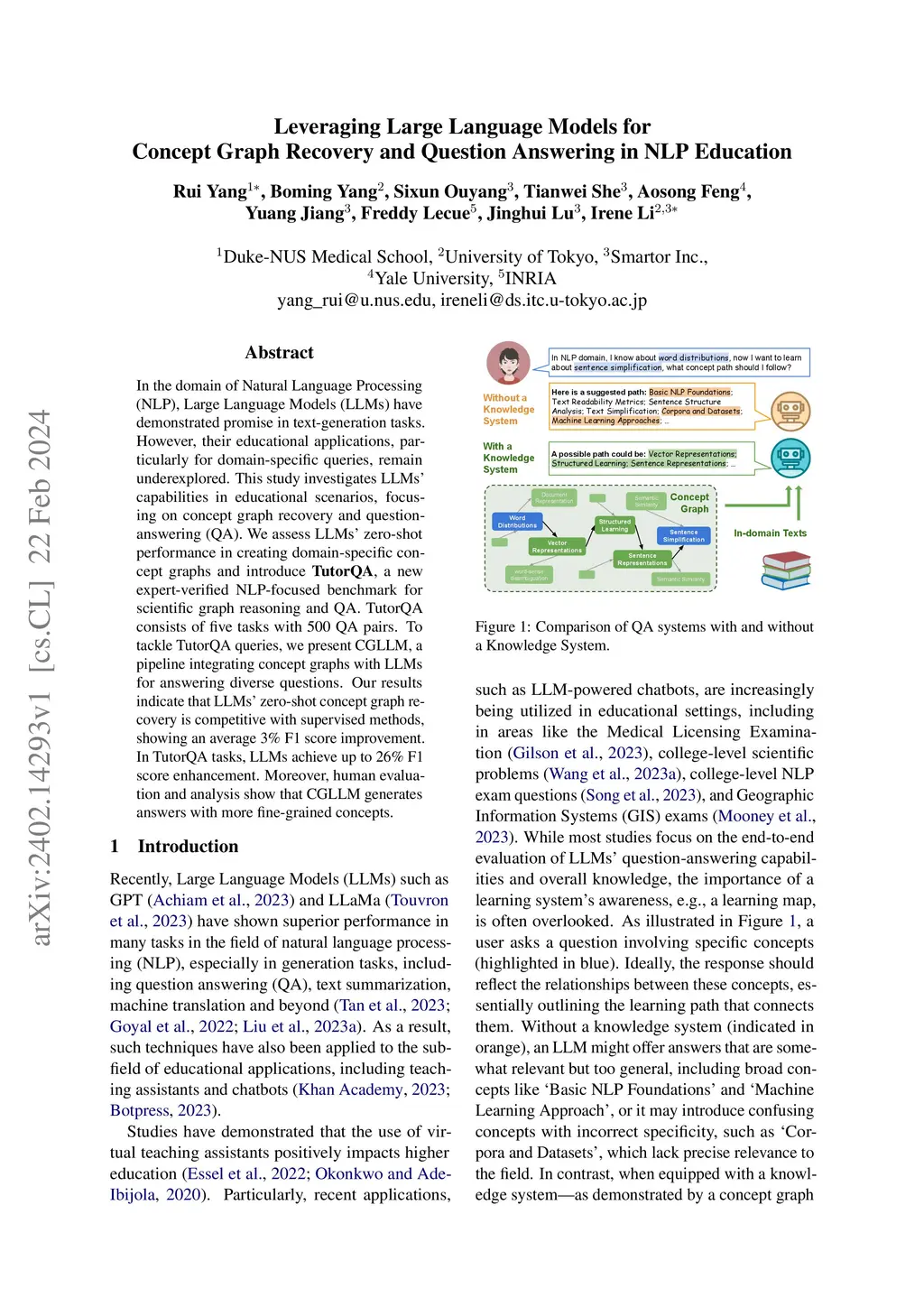 In the domain of Natural Language Processing (NLP), Large Language Models (LLMs) have demonstrated promise in text-generation tasks. However, their educational applications, particularly for domain-specific queries, remain underexplored. This study investigates LLMs' capabilities in educational scenarios, focusing on concept graph recovery and question-answering (QA). We assess LLMs' zero-shot performance in creating domain-specific concept graphs and introduce TutorQA, a new expert-verified NLP-focused benchmark for scientific graph reasoning and QA. TutorQA consists of five tasks with 500 QA pairs. To tackle TutorQA queries, we present CGLLM, a pipeline integrating concept graphs with LLMs for answering diverse questions. Our results indicate that LLMs' zero-shot concept graph recovery is competitive with supervised methods, showing an average 3% F1 score improvement. In TutorQA tasks, LLMs achieve up to 26% F1 score enhancement. Moreover, human evaluation and analysis show that CGLLM generates answers with more fine-grained concepts.