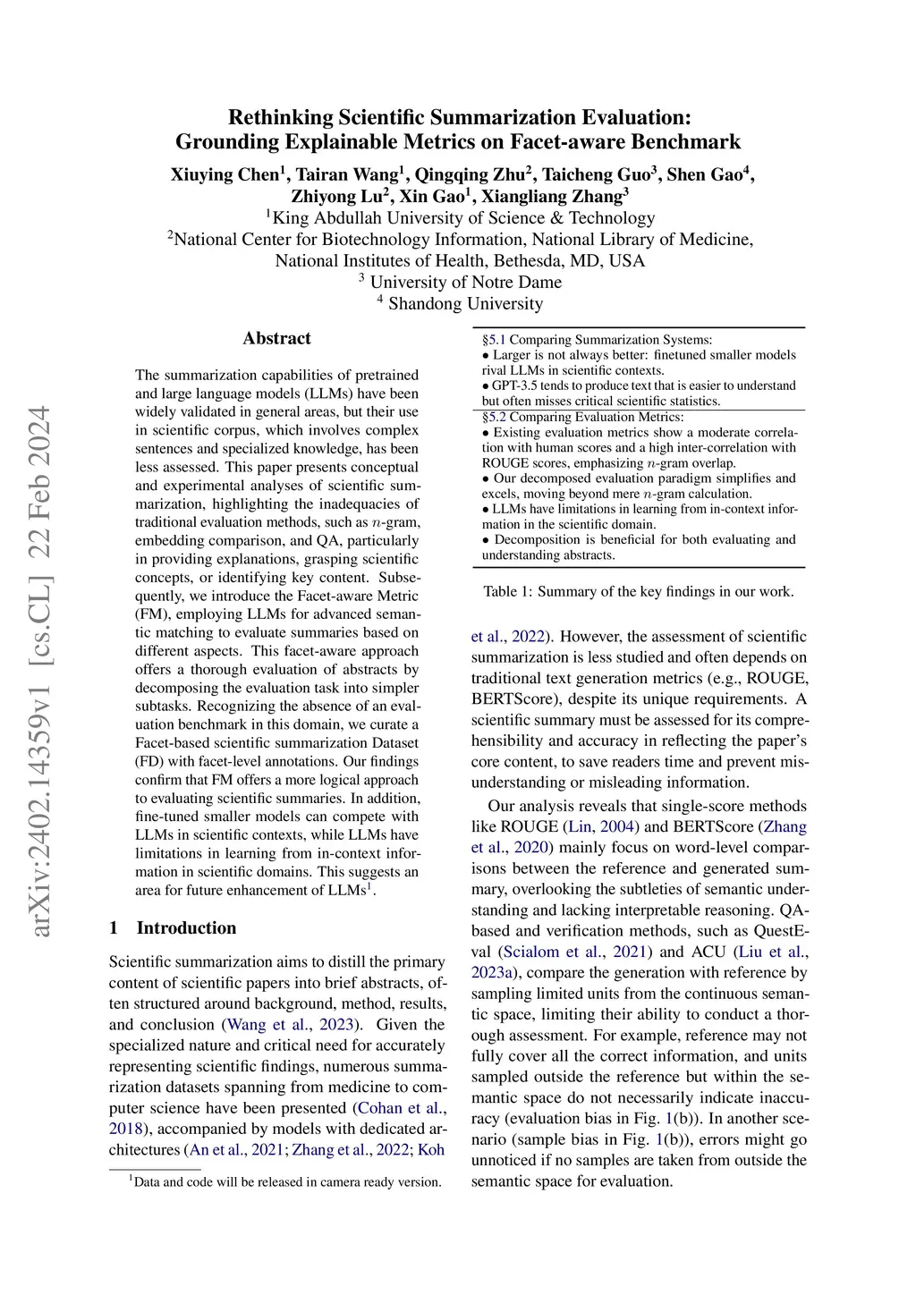 The summarization capabilities of pretrained and large language models (LLMs) have been widely validated in general areas, but their use in scientific corpus, which involves complex sentences and specialized knowledge, has been less assessed. This paper presents conceptual and experimental analyses of scientific summarization, highlighting the inadequacies of traditional evaluation methods, such as -gram, embedding comparison, and QA, particularly in providing explanations, grasping scientific concepts, or identifying key content. Subsequently, we introduce the Facet-aware Metric (FM), employing LLMs for advanced semantic matching to evaluate summaries based on different aspects. This facet-aware approach offers a thorough evaluation of abstracts by decomposing the evaluation task into simplerthis http URLthe absence of an evaluation benchmark in this domain, we curate a Facet-based scientific summarization Dataset (FD) with facet-level annotations. Our findings confirm that FM offers a more logical approach to evaluating scientific summaries. In addition, fine-tuned smaller models can compete with LLMs in scientific contexts, while LLMs have limitations in learning from in-context information in scientific domains. This suggests an area for future enhancement of LLMs.