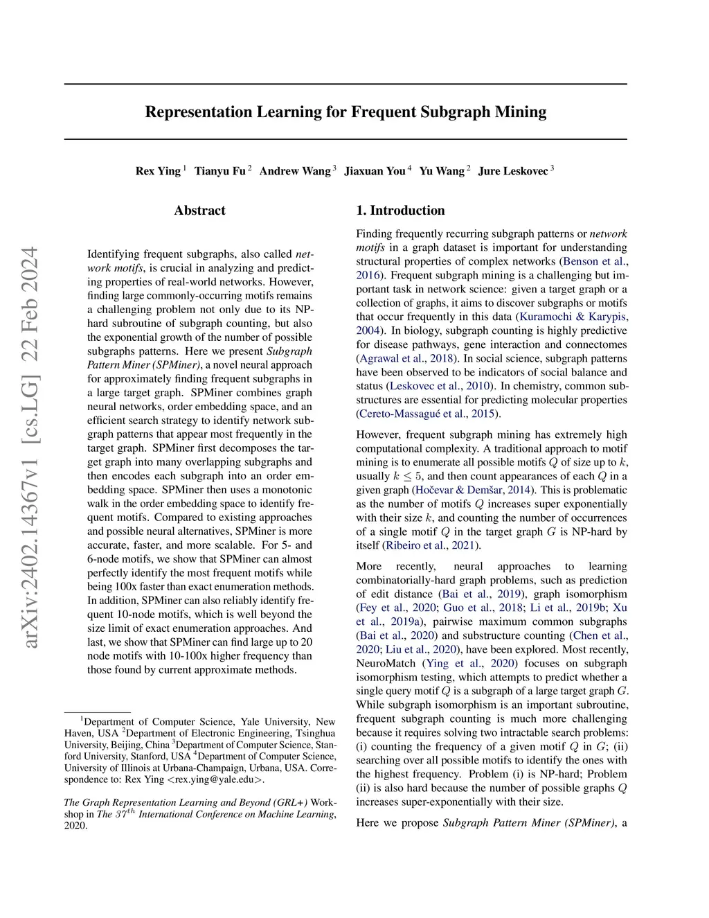 Identifying frequent subgraphs, also called network motifs, is crucial in analyzing and predicting properties of real-world networks. However, finding large commonly-occurring motifs remains a challenging problem not only due to its NP-hard subroutine of subgraph counting, but also the exponential growth of the number of possible subgraphs patterns. Here we present Subgraph Pattern Miner (SPMiner), a novel neural approach for approximately finding frequent subgraphs in a large target graph. SPMiner combines graph neural networks, order embedding space, and an efficient search strategy to identify network subgraph patterns that appear most frequently in the target graph. SPMiner first decomposes the target graph into many overlapping subgraphs and then encodes each subgraph into an order embedding space. SPMiner then uses a monotonic walk in the order embedding space to identify frequent motifs. Compared to existing approaches and possible neural alternatives, SPMiner is more accurate, faster, and more scalable. For 5- and 6-node motifs, we show that SPMiner can almost perfectly identify the most frequent motifs while being 100x faster than exact enumeration methods. In addition, SPMiner can also reliably identify frequent 10-node motifs, which is well beyond the size limit of exact enumeration approaches. And last, we show that SPMiner can find large up to 20 node motifs with 10-100x higher frequency than those found by current approximate methods.