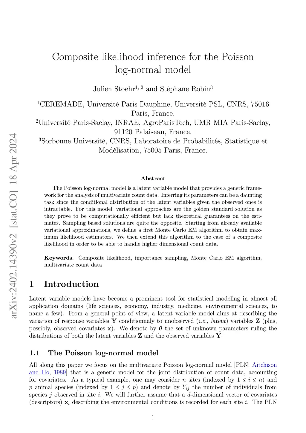 Inferring parameters of a latent variable model can be a daunting task when the conditional distribution of the latent variables given the observed ones is intractable. Variational approaches prove to be computationally efficient but, possibly, lack theoretical guarantees on the estimates, while sampling based solutions are quite the opposite. Starting from already available variational approximations, we define a first Monte Carlo EM algorithm to obtain maximum likelihood estimators, focusing on the Poisson log-normal model which provides a generic framework for the analysis of multivariate count data. We then extend this algorithm to the case of a composite likelihood in order to be able to handle higher dimensional count data.