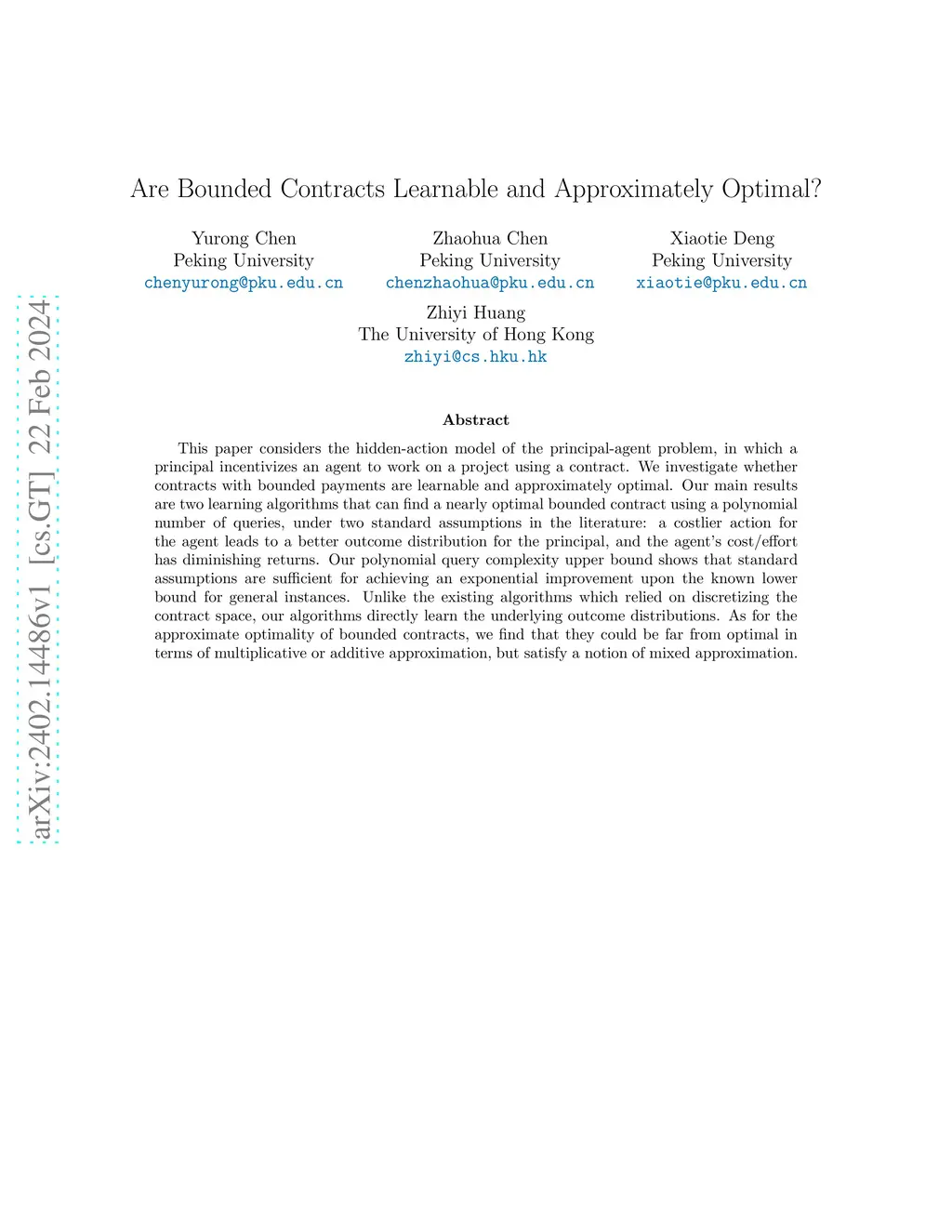 This paper considers the hidden-action model of the principal-agent problem, in which a principal incentivizes an agent to work on a project using a contract. We investigate whether contracts with bounded payments are learnable and approximately optimal. Our main results are two learning algorithms that can find a nearly optimal bounded contract using a polynomial number of queries, under two standard assumptions in the literature: a costlier action for the agent leads to a better outcome distribution for the principal, and the agent's cost/effort has diminishing returns. Our polynomial query complexity upper bound shows that standard assumptions are sufficient for achieving an exponential improvement upon the known lower bound for general instances. Unlike the existing algorithms, which relied on discretizing the contract space, our algorithms directly learn the underlying outcome distributions. As for the approximate optimality of bounded contracts, we find that they could be far from optimal in terms of multiplicative or additive approximation, but satisfy a notion of mixed approximation.