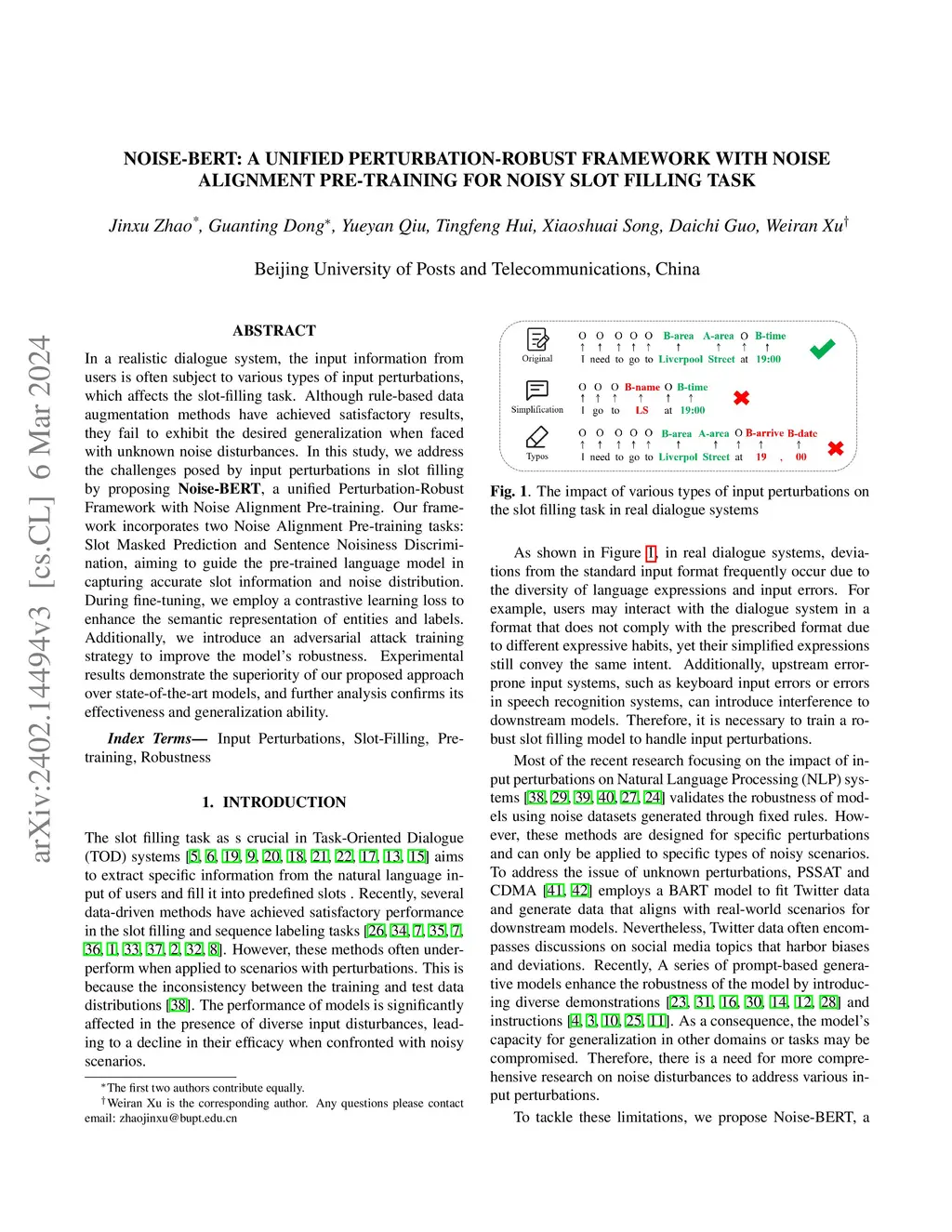 In a realistic dialogue system, the input information from users is often subject to various types of input perturbations, which affects the slot-filling task. Although rule-based data augmentation methods have achieved satisfactory results, they fail to exhibit the desired generalization when faced with unknown noise disturbances. In this study, we address the challenges posed by input perturbations in slot filling by proposing Noise-BERT, a unified Perturbation-Robust Framework with Noise Alignment Pre-training. Our framework incorporates two Noise Alignment Pre-training tasks: Slot Masked Prediction and Sentence Noisiness Discrimination, aiming to guide the pre-trained language model in capturing accurate slot information and noise distribution. During fine-tuning, we employ a contrastive learning loss to enhance the semantic representation of entities and labels. Additionally, we introduce an adversarial attack training strategy to improve the model's robustness. Experimental results demonstrate the superiority of our proposed approach over state-of-the-art models, and further analysis confirms its effectiveness and generalization ability.