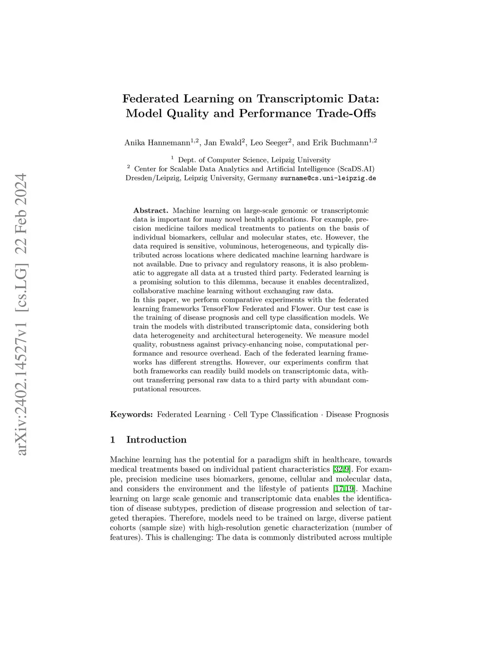Machine learning on large-scale genomic or transcriptomic data is important for many novel health applications. For example, precision medicine tailors medical treatments to patients on the basis of individual biomarkers, cellular and molecular states, etc. However, the data required is sensitive, voluminous, heterogeneous, and typically distributed across locations where dedicated machine learning hardware is not available. Due to privacy and regulatory reasons, it is also problematic to aggregate all data at a trusted third party. Federated learning is a promising solution to this dilemma, because it enables decentralized, collaborative machine learning without exchanging raw data. In this paper, we perform comparative experiments with the federated learning frameworks TensorFlow Federated and Flower. Our test case is the training of disease prognosis and cell type classification models. We train the models with distributed transcriptomic data, considering both data heterogeneity and architectural heterogeneity. We measure model quality, robustness against privacy-enhancing noise and computational performance. We evaluate the resource overhead of a federated system from both client and global perspectives and assess benefits and limitations. Each of the federated learning frameworks has different strengths. However, our experiments confirm that both frameworks can readily build models on transcriptomic data, without transferring personal raw data to a third party with abundant computational resources. This paper is the extended version ofthis https URL.