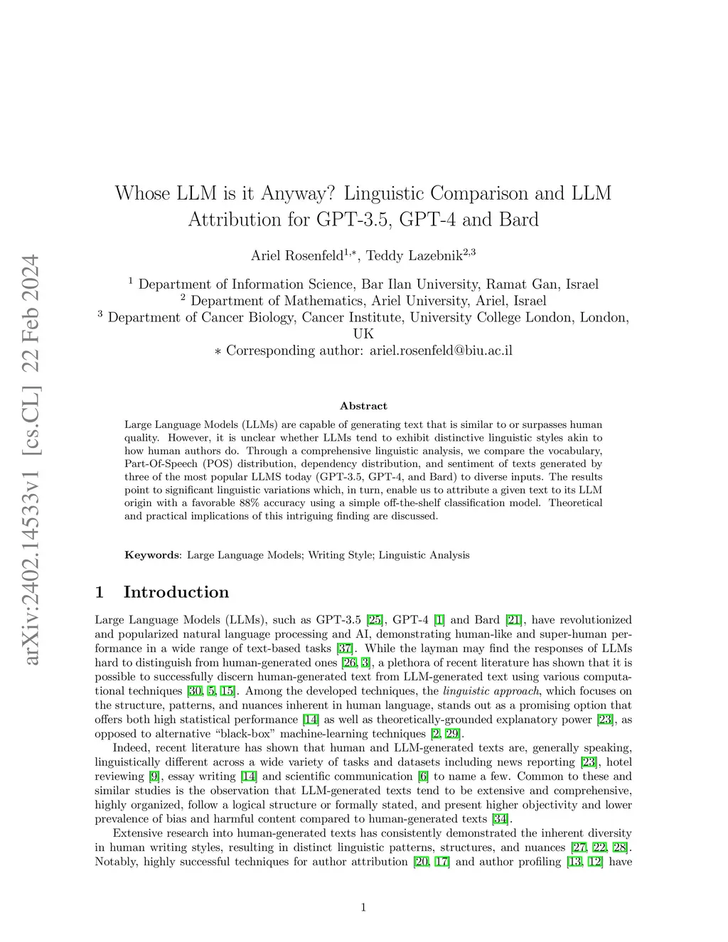 Whose LLM is it Anyway? Linguistic Comparison and LLM Attribution for GPT-3.5, GPT-4 and Bard