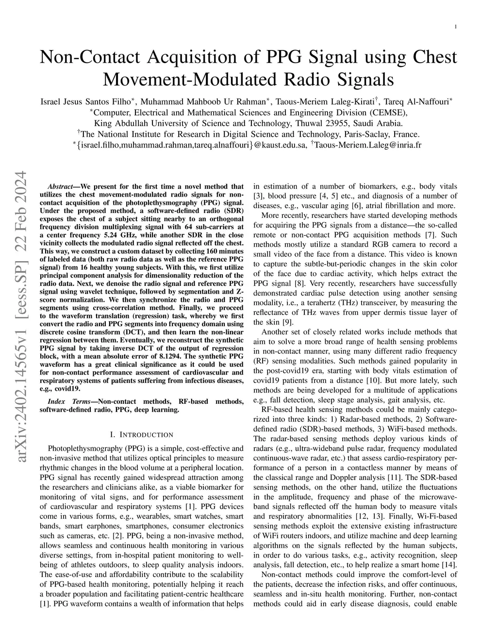 We present for the first time a novel method that utilizes the chest movement-modulated radio signals for non-contact acquisition of the photoplethysmography (PPG) signal. Under the proposed method, a software-defined radio (SDR) exposes the chest of a subject sitting nearby to an orthogonal frequency division multiplexing signal with 64 sub-carriers at a center frequency 5.24 GHz, while another SDR in the close vicinity collects the modulated radio signal reflected off the chest. This way, we construct a custom dataset by collecting 160 minutes of labeled data (both raw radio data as well as the reference PPG signal) from 16 healthy young subjects. With this, we first utilize principal component analysis for dimensionality reduction of the radio data. Next, we denoise the radio signal and reference PPG signal using wavelet technique, followed by segmentation and Z-score normalization. We then synchronize the radio and PPG segments using cross-correlation method. Finally, we proceed to the waveform translation (regression) task, whereby we first convert the radio and PPG segments into frequency domain using discrete cosine transform (DCT), and then learn the non-linear regression between them. Eventually, we reconstruct the synthetic PPG signal by taking inverse DCT of the output of regression block, with a mean absolute error of 8.1294. The synthetic PPG waveform has a great clinical significance as it could be used for non-contact performance assessment of cardiovascular and respiratory systems of patients suffering from infectious diseases, e.g., covid19.
