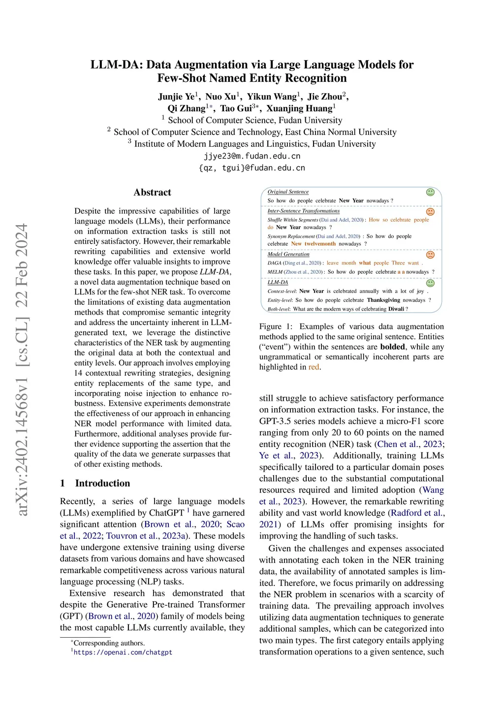 Despite the impressive capabilities of large language models (LLMs), their performance on information extraction tasks is still not entirely satisfactory. However, their remarkable rewriting capabilities and extensive world knowledge offer valuable insights to improve these tasks. In this paper, we propose , a novel data augmentation technique based on LLMs for the few-shot NER task. To overcome the limitations of existing data augmentation methods that compromise semantic integrity and address the uncertainty inherent in LLM-generated text, we leverage the distinctive characteristics of the NER task by augmenting the original data at both the contextual and entity levels. Our approach involves employing 14 contextual rewriting strategies, designing entity replacements of the same type, and incorporating noise injection to enhance robustness. Extensive experiments demonstrate the effectiveness of our approach in enhancing NER model performance with limited data. Furthermore, additional analyses provide further evidence supporting the assertion that the quality of the data we generate surpasses that of other existing methods.
