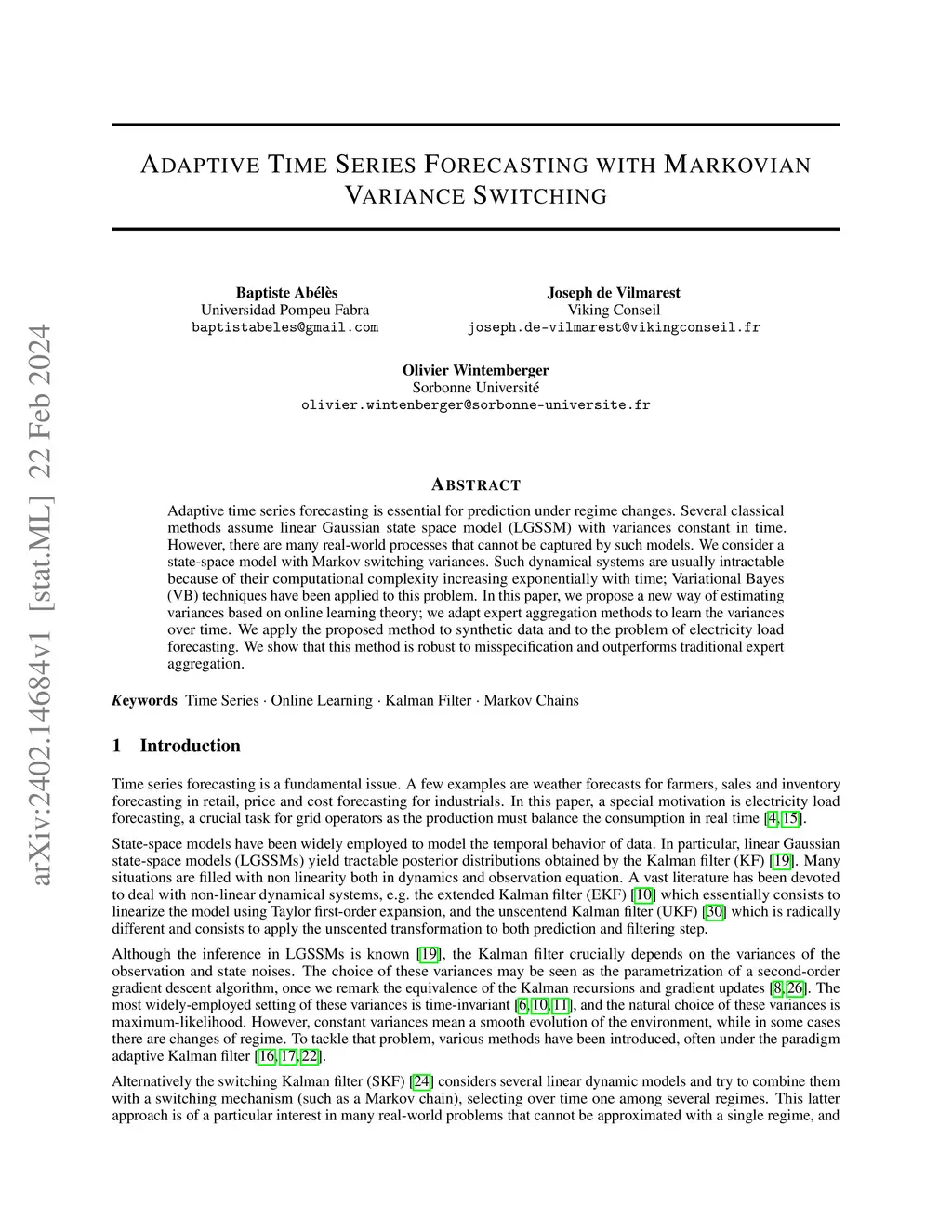 Adaptive time series forecasting is essential for prediction under regime changes. Several classical methods assume linear Gaussian state space model (LGSSM) with variances constant in time. However, there are many real-world processes that cannot be captured by such models. We consider a state-space model with Markov switching variances. Such dynamical systems are usually intractable because of their computational complexity increasing exponentially with time; Variational Bayes (VB) techniques have been applied to this problem. In this paper, we propose a new way of estimating variances based on online learning theory; we adapt expert aggregation methods to learn the variances over time. We apply the proposed method to synthetic data and to the problem of electricity load forecasting. We show that this method is robust to misspecification and outperforms traditional expert aggregation.