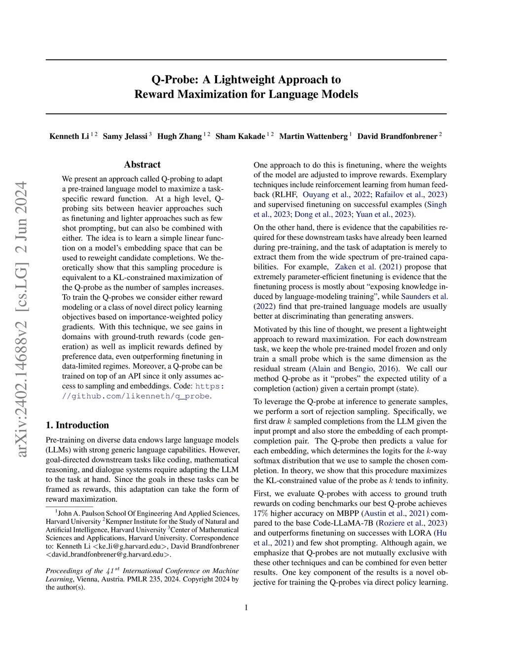 We present an approach called Q-probing to adapt a pre-trained language model to maximize a task-specific reward function. At a high level, Q-probing sits between heavier approaches such as finetuning and lighter approaches such as few shot prompting, but can also be combined with either. The idea is to learn a simple linear function on a model's embedding space that can be used to reweight candidate completions. We theoretically show that this sampling procedure is equivalent to a KL-constrained maximization of the Q-probe as the number of samples increases. To train the Q-probes we consider either reward modeling or a class of novel direct policy learning objectives based on importance weighted policy gradients. With this technique, we see gains in domains with ground-truth rewards (code generation) as well as implicit rewards defined by preference data, even outperforming finetuning in data-limited regimes. Moreover, a Q-probe can be trained on top of an API since it only assumes access to sampling and embeddings. Code: https://github.com/likenneth/q_probe .