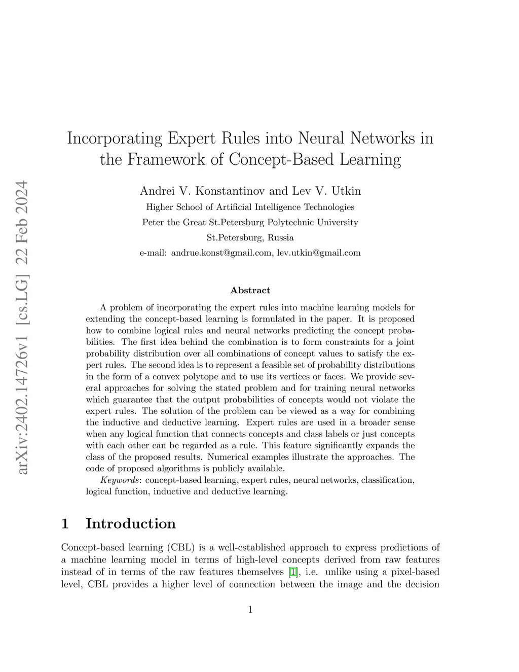 A problem of incorporating the expert rules into machine learning models for extending the concept-based learning is formulated in the paper. It is proposed how to combine logical rules and neural networks predicting the concept probabilities. The first idea behind the combination is to form constraints for a joint probability distribution over all combinations of concept values to satisfy the expert rules. The second idea is to represent a feasible set of probability distributions in the form of a convex polytope and to use its vertices or faces. We provide several approaches for solving the stated problem and for training neural networks which guarantee that the output probabilities of concepts would not violate the expert rules. The solution of the problem can be viewed as a way for combining the inductive and deductive learning. Expert rules are used in a broader sense when any logical function that connects concepts and class labels or just concepts with each other can be regarded as a rule. This feature significantly expands the class of the proposed results. Numerical examples illustrate the approaches. The code of proposed algorithms is publicly available.