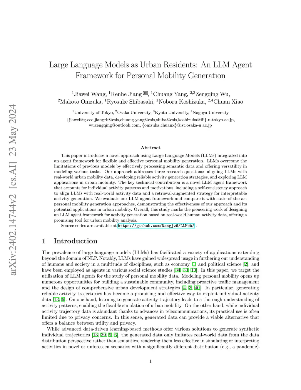 This paper introduces a novel approach using Large Language Models (LLMs) integrated into an agent framework for flexible and effective personal mobility generation. LLMs overcome the limitations of previous models by effectively processing semantic data and offering versatility in modeling various tasks. Our approach addresses three research questions: aligning LLMs with real-world urban mobility data, developing reliable activity generation strategies, and exploring LLM applications in urban mobility. The key technical contribution is a novel LLM agent framework that accounts for individual activity patterns and motivations, including a self-consistency approach to align LLMs with real-world activity data and a retrieval-augmented strategy for interpretable activity generation. We evaluate our LLM agent framework and compare it with state-of-the-art personal mobility generation approaches, demonstrating the effectiveness of our approach and its potential applications in urban mobility. Overall, this study marks the pioneering work of designing an LLM agent framework for activity generation based on real-world human activity data, offering a promising tool for urban mobility analysis.