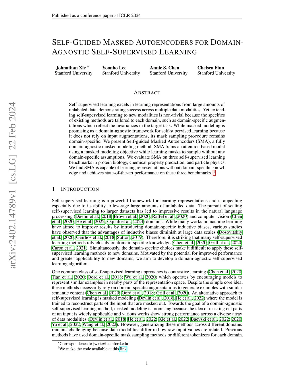 Self-supervised learning excels in learning representations from large amounts of unlabeled data, demonstrating success across multiple data modalities. Yet, extending self-supervised learning to new modalities is non-trivial because the specifics of existing methods are tailored to each domain, such as domain-specific augmentations which reflect the invariances in the target task. While masked modeling is promising as a domain-agnostic framework for self-supervised learning because it does not rely on input augmentations, its mask sampling procedure remains domain-specific. We present Self-guided Masked Autoencoders (SMA), a fully domain-agnostic masked modeling method. SMA trains an attention based model using a masked modeling objective, by learning masks to sample without any domain-specific assumptions. We evaluate SMA on three self-supervised learning benchmarks in protein biology, chemical property prediction, and particle physics. We find SMA is capable of learning representations without domain-specific knowledge and achieves state-of-the-art performance on these three benchmarks.